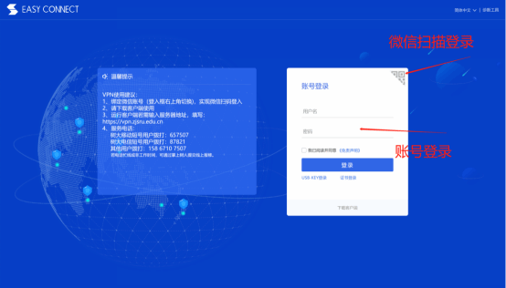 非学校教职工可通过浏览器打开https://60.191.53.250,使用账户密码登录或微信扫码登录,校内教职工账户密码即为统一身份认证账号密码,校外教职工需通过告知的账户密码进行登,VPN客户端服务器地址https://vpn.zjsru.edu.cn