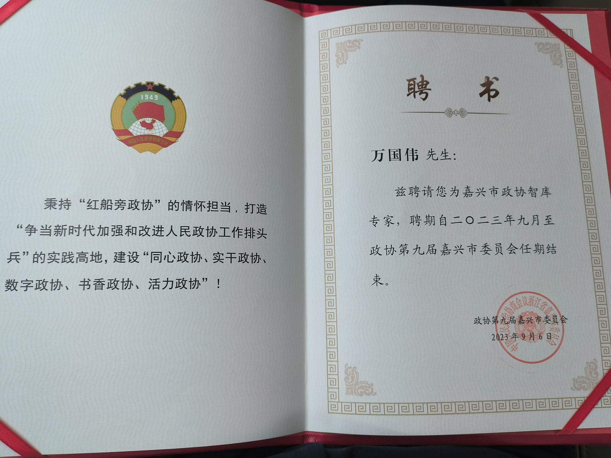 近日,政协嘉兴市委员会公布了嘉兴市政协首批智库专家名单,省政协委员、永利官网民盟支部主委万国伟教授成功入选。嘉兴市政协主席陈利众出席仪式并为受聘人员颁发聘书。
