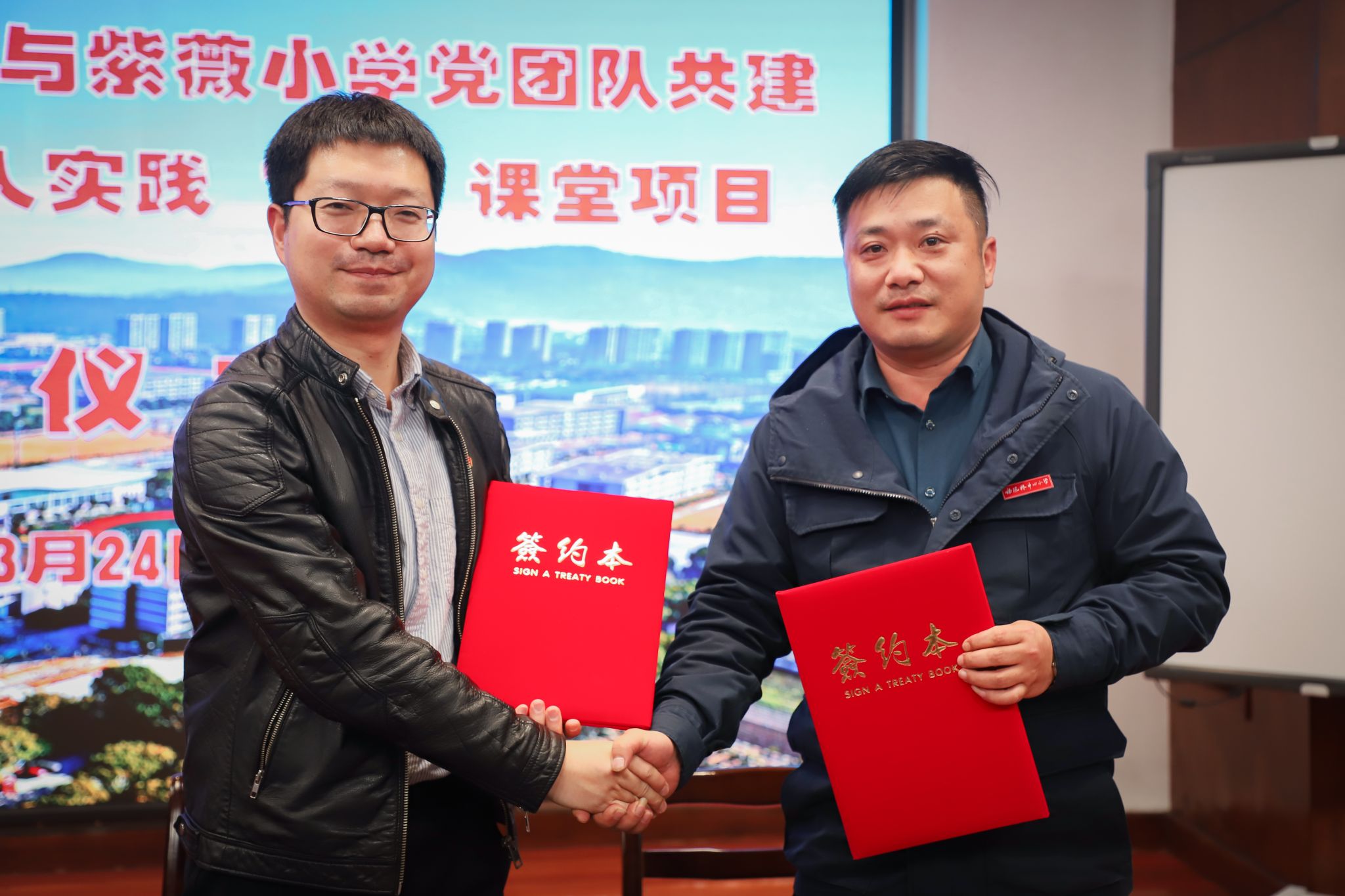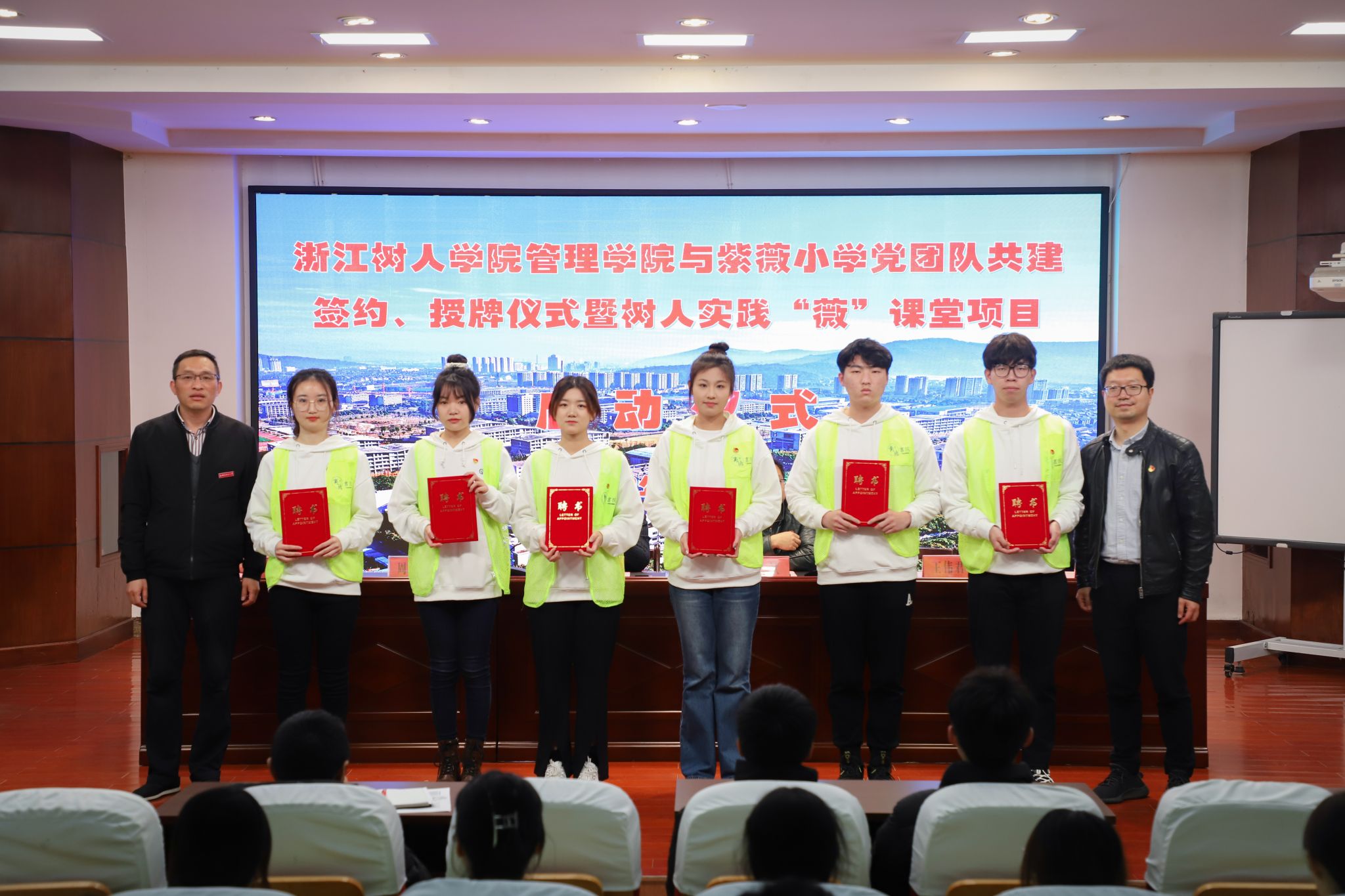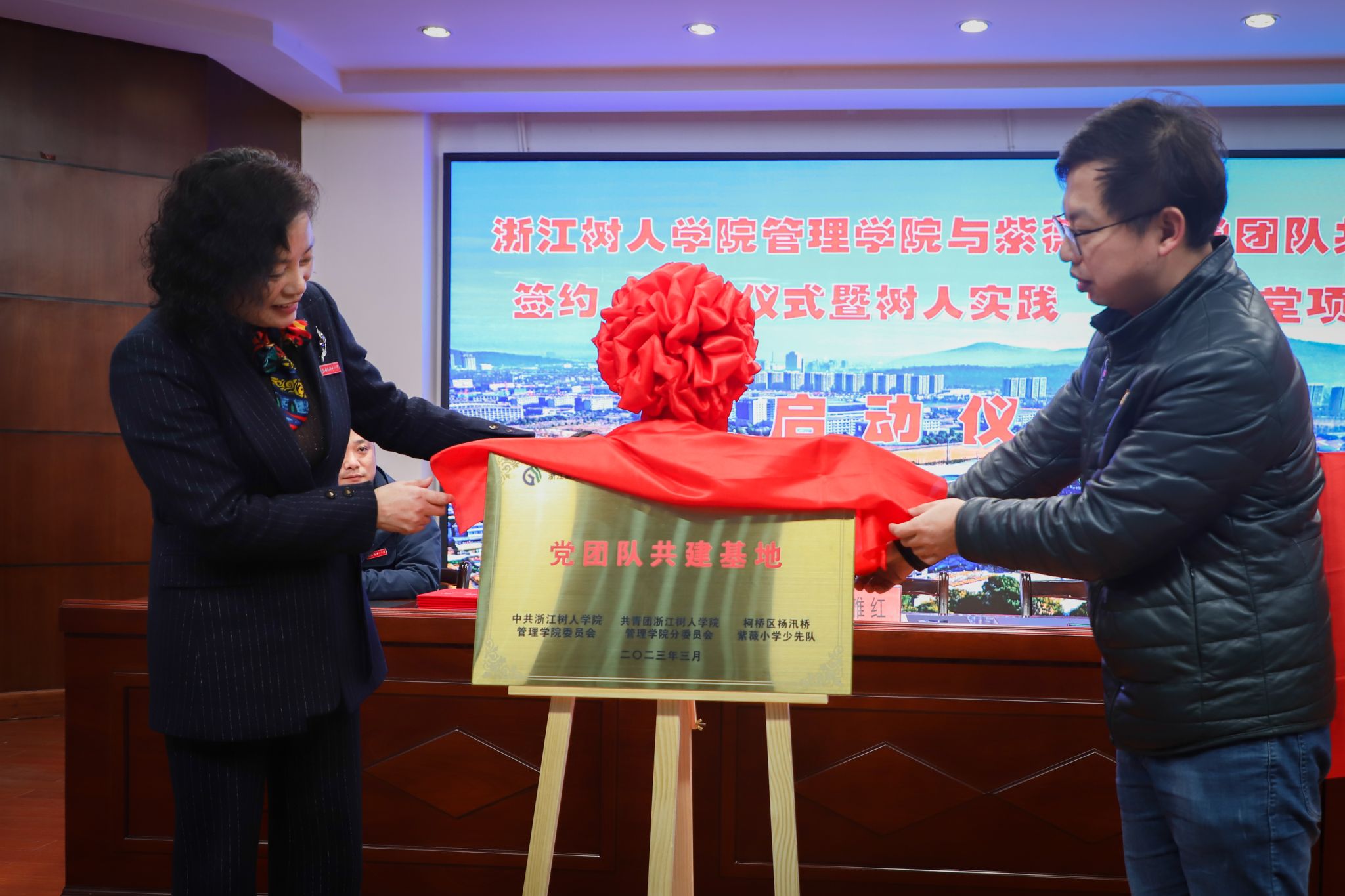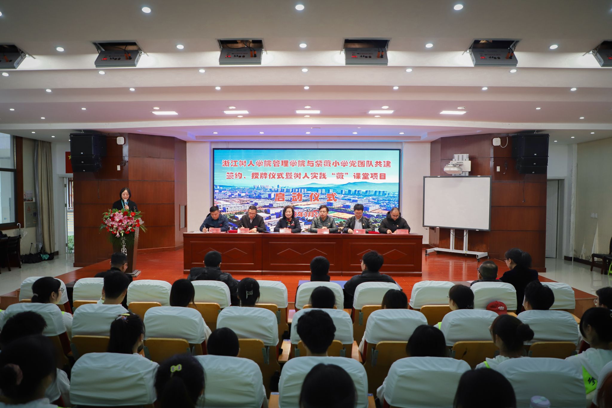 为深入贯彻落实党的二十大精神,着力推动党、团、队育人链条相衔接、相贯通,努力培养德智体美劳全面发展的社会主义建设者和接班人,3月24日下午,304永利集团官网管理学院与柯桥区杨汛桥紫薇小学在紫薇小学报告厅隆重举行党团队共建签约、授牌仪式暨树人实践“薇”课堂项目启动仪式。管理学院党委副书记曹斌、书院副院长兼党委副书记王伟君、紫薇小学校长李雅红、副校长张明、周国标出席签约仪式。紫薇小学所有中层领导、教师代表、学生代表及管理学院教师代表、志愿者代表等参加仪式,共同见证基地揭牌。