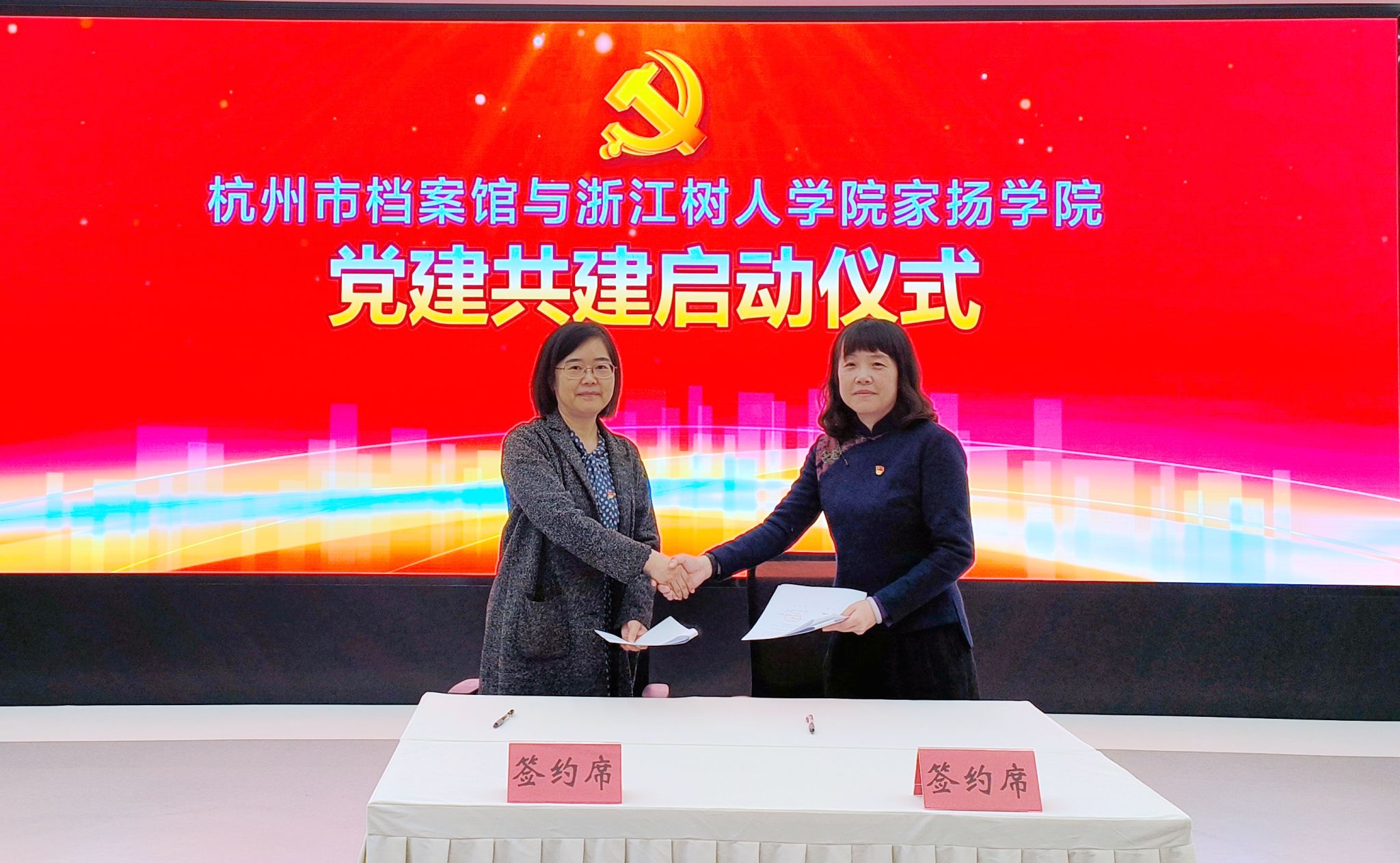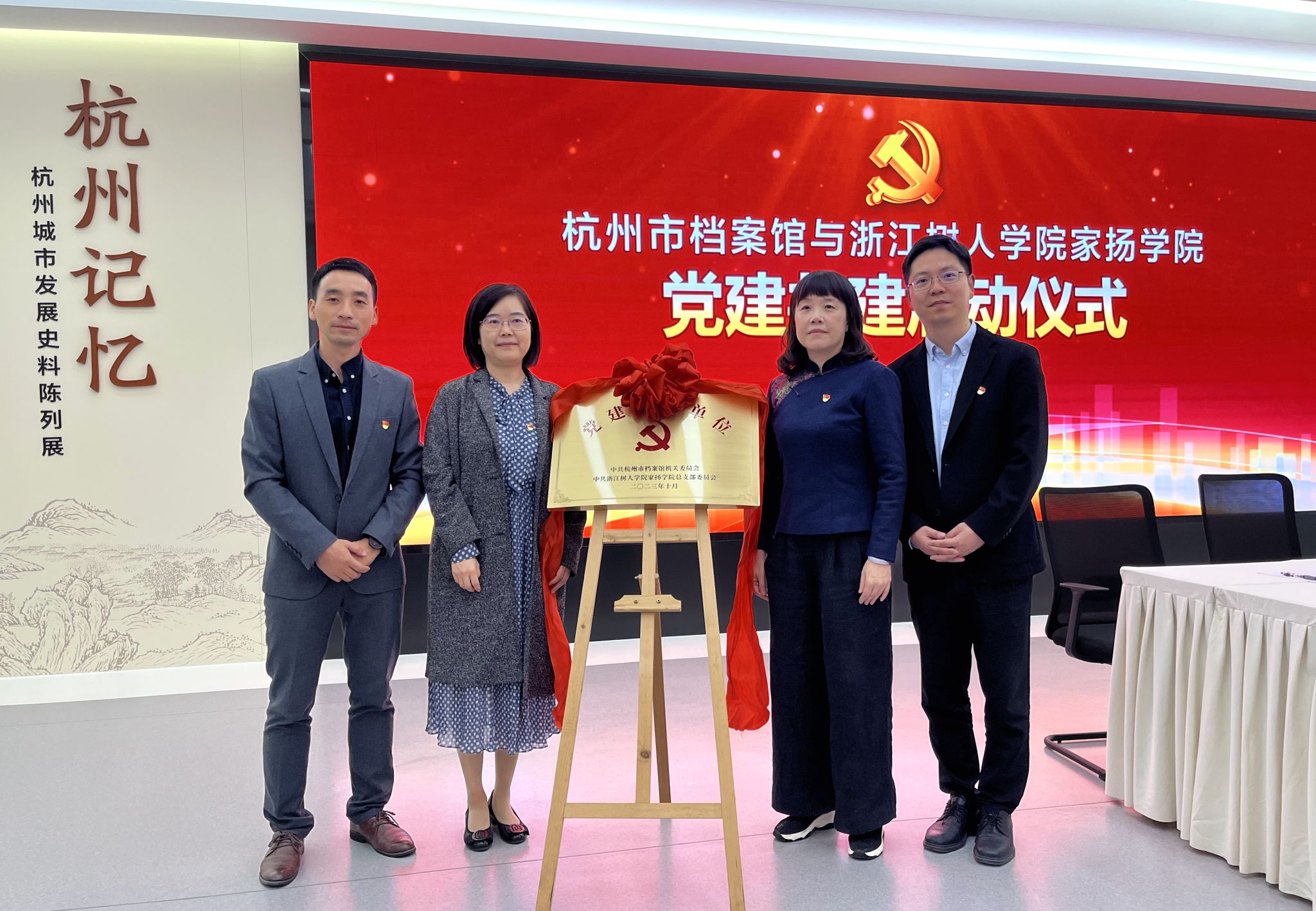 为深入学习贯彻习近平新时代中国特色社会主义思想和党的二十大精神,家扬学院与杭州市档案馆在前期深入交流的基础上,双方于2023年10月20日在杭州市档案馆举行了党建共建签约揭牌仪式。杭州市档案馆机关党委专职副书记王彬、档案文化处处长毛贤广,家扬学院党总支书记、院长董弋芬,副书记冯伟,学院党员师生代表等人共同见证了这一重要时刻。
