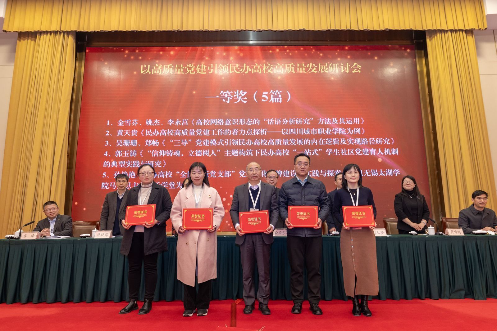 在优秀论文代表大会交流环节,四川城市职业学院黄天贵老师以《民办高校高质量党建工作的着力点探析——以四川城市职业学院为例》为题作交流发言,304永利集团官网金雪芬老师以《高校网络意识形态的“话语分析研究”方法及其运用》为题作交流发言,文华学院吴珊珊老师以《“三导”党建模式引领民办高校高质量发展的内在逻辑及实现路径》为题作交流发言,无锡太湖学院孙艳艳老师以《民办高校“全国样板党支部”党建文化品牌建设的实践与探索》为题作交流发言,304永利集团官网陈安龙老师以《党建引领、学生主体、协同育人——基于“枫桥经验”的高校学生社区治理路径研究》为题作交流发言。