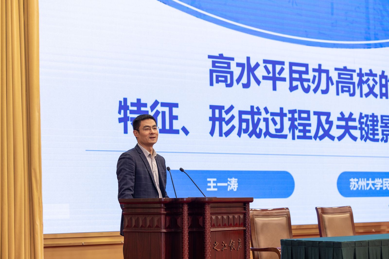 苏州大学东吴智库(江苏省重点培育智库)研究员、博士生导师、民办教育研究中心主任王一涛教授以《高水平民办高校的特征、形成过程及关键影响因素》为题作专家报告。他围绕高水平民办高校的形成、高水平民办高校的理论分析框架——复合基础观,以及复合基础观视角下高水平民办高校的特征、形成与影响因素三个方面,详细阐述了高水平民办高校的特征、形成过程及关键影响因素。他强调,具有复合式能力的民办高校,在坚持公益、教育理念卓著、管理能力卓著的举办者的领导下,通过复合(联合)式竞争策略,满足了学生多方面的需求,从而建立起了核心竞争力。