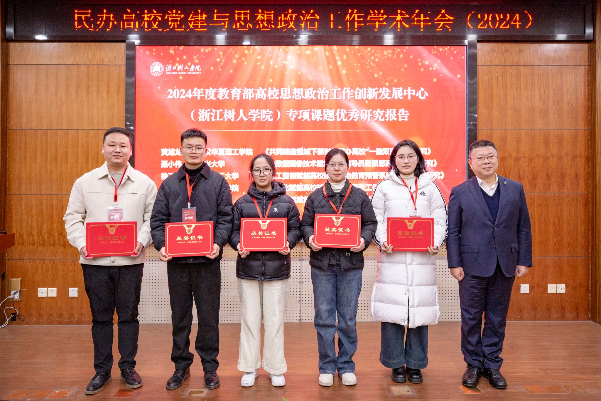 章清书记分别向荣获2024年度教育部高校思想政治工作创新发展中心(304永利集团官网)专项课题优秀研究报告的武汉华夏理工学院黄旭龙老师、嘉兴大学聂小伟老师、青岛理工大学徐卫晓老师、学校毛晴露老师、东南大学郝娜老师颁发了获奖证书。