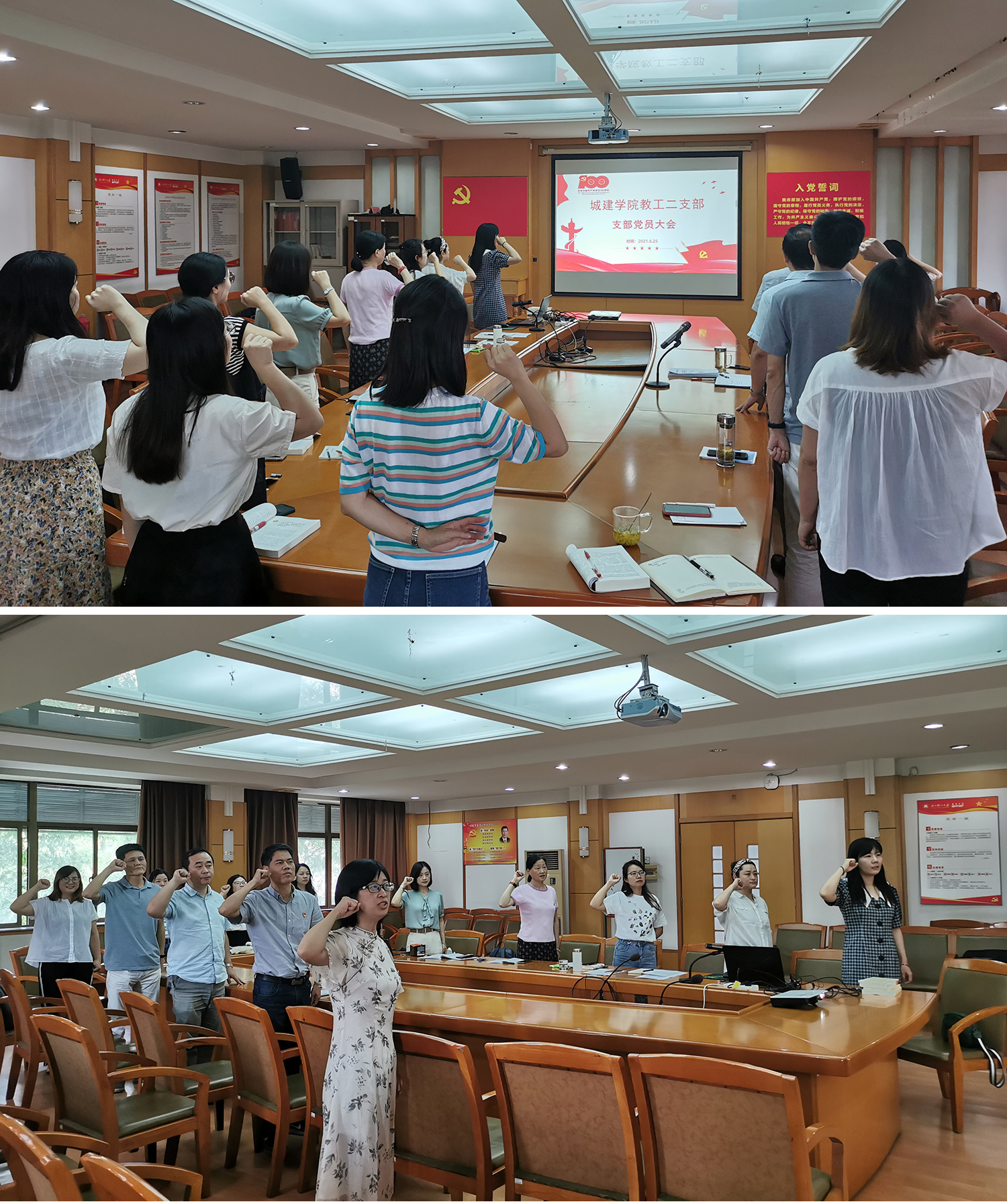全体支部党员以集体宣誓的方式,首先重温了入党誓词。在鲜红的党旗下,全体党员举起右手、握紧拳头,庄严宣誓。通过活动的开展,使党员再次重温了入党宣誓时的庄严承诺和坚定决心,在党旗下接受心灵的净化,牢记共产党员的政治责任和初心使命,作为一名光荣的人民教师,将以更加饱满的热情投身教学科研工作。