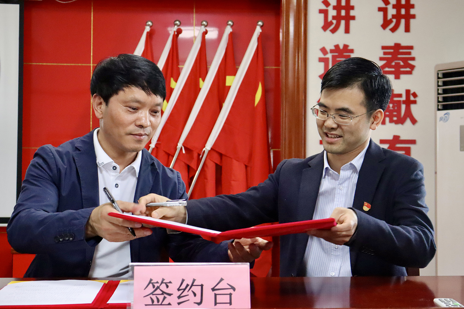 庄严国歌声后,廖华跃、童妙来签署了“院村共建”协议书,并进行“党建教育基地”授牌仪式。