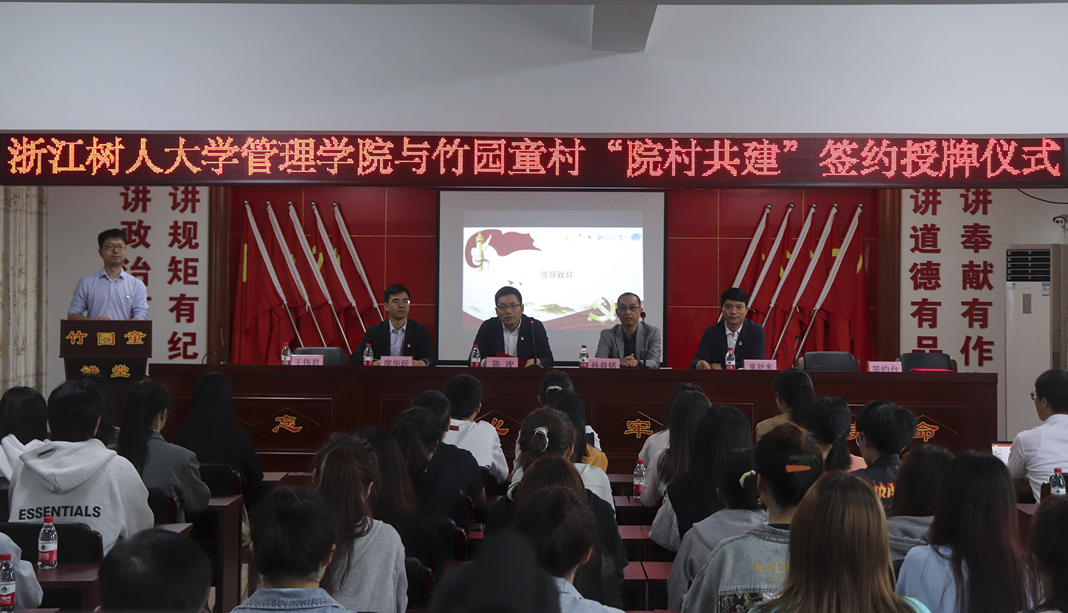 5月18日下午,浙江树人大学管理学院(商德书院)——竹园童村院村合作签约暨授牌仪式在竹园童村党员之家隆重举行,浙江树人大学副校长陈浚,浙江树人大学管理学院党委书记廖华跃、管理学院(商德书院)书院副院长王伟君、绍兴市柯桥区杨汛桥街道党工委委员孙益铭、竹园童村党总支书记、村委主任童妙来,浙江树人大学管理学院(商德书院)党员教师代表、以及拟发展党员学生、竹园童村党员骨干代表近百人参加。