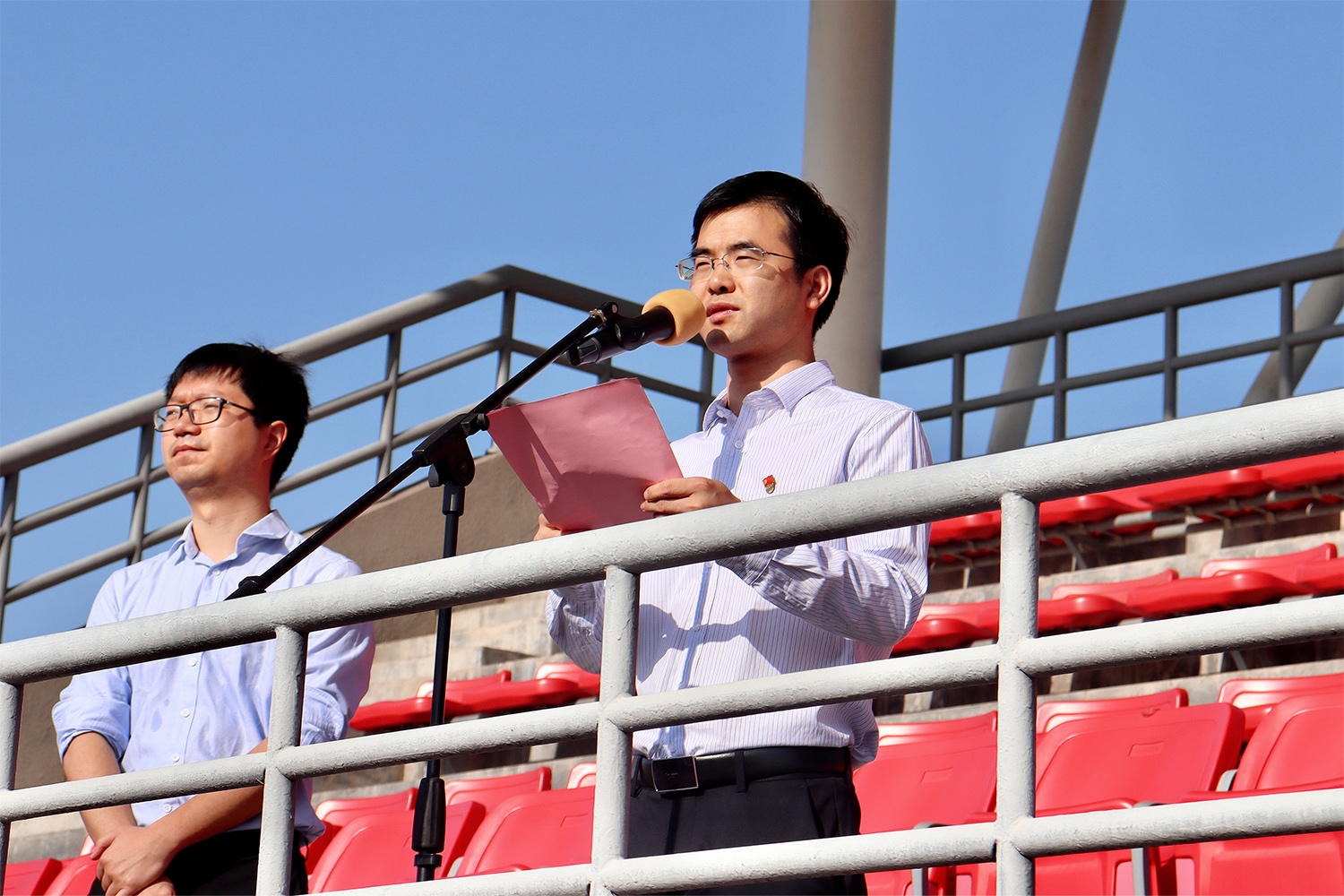 迎着初升的太阳,伴随着雄壮激昂的义勇军进行曲,鲜艳的五星红旗冉冉升起,迎风飘扬。国旗下,党委书记廖华跃为同学们上了一节生动、鲜活的党课。他以国歌的历史作为切入点,带领大家回顾了中国共产党可歌可泣的苦难历程、彪炳史册的伟大胜利和举世瞩目的辉煌成就,令人激情澎湃,豪情满怀,真正达到了明理增信、崇德力行的学习效果。廖华跃指出,学习党史要坚持用党的实践创造和历史经验启迪智慧、砥砺品格,让我们在复杂形势面前不迷航、在艰巨斗争面前不退缩,深刻领悟中国共产党为什么能、马克思主义为什么行、中国特色社会主义为什么好的历史逻辑、理论逻辑、实践逻辑。他希望全院师生从党的百年伟大征程中接受精神洗礼,真正做到学党史、悟思想、办实事、开新局,推动学院党史学习教育高质量开展。