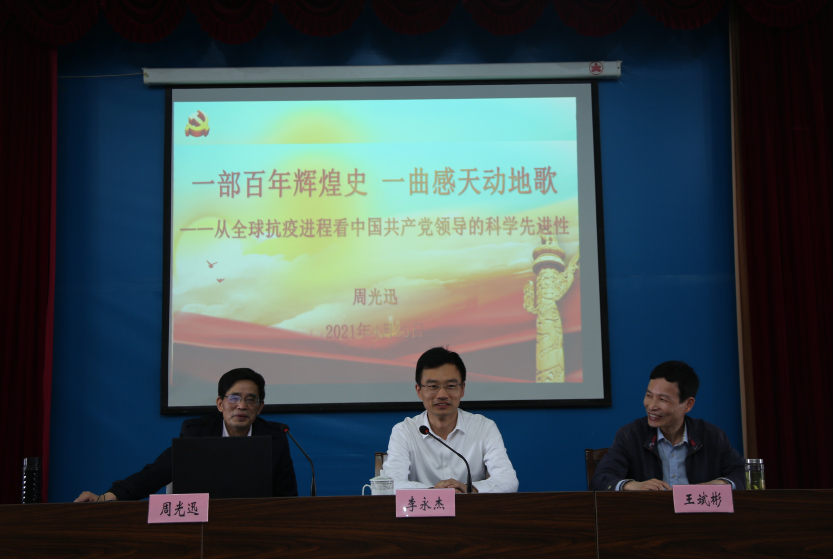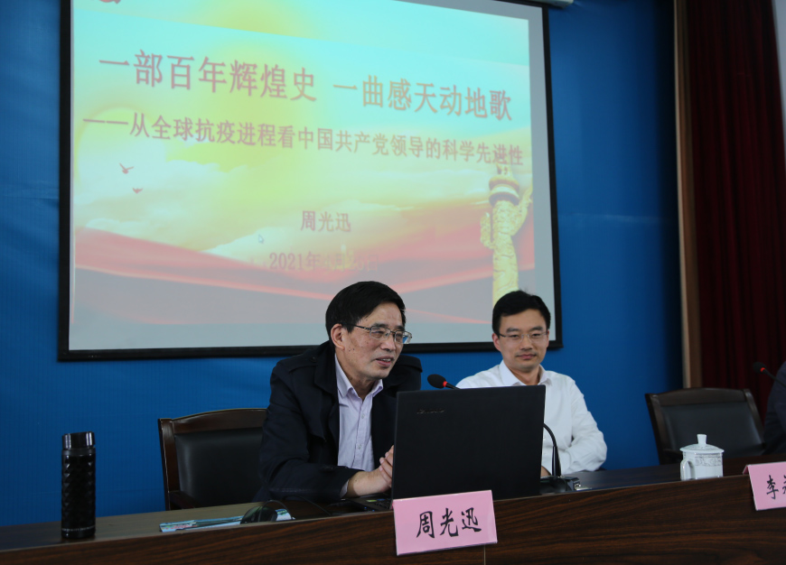 周院长首先从中国共产党百年辉煌史的简略回顾出发,以当前国际国内形势为现实依据,用慷慨激昂的态度和生动鲜活的事例为全体党员干部讲述了在新形势新时代背景下中国共产党的担当和作为,并深入剖析了中国共产党在新冠抗疫战争中展现出的科学先进性和社会主义制度彰显出的巨大优越性。