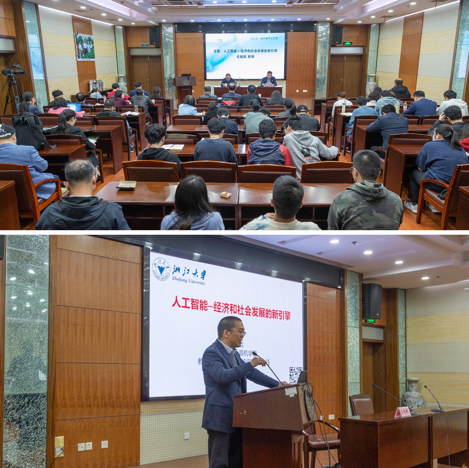 庄越挺教授引用习近平总书记在2018年世界人工智能大会上的贺信“新一代人工智能正在全球范围内蓬勃兴起,为经济社会发展注入了新动能,正在深刻改变人们的生产生活方式”为引言,从大数据智能、关键技术理论突破、可泛化的知识计算引擎、AI+经济等给与会人员带来一场不一样的视觉听觉盛宴。他重点围绕数字经济,介绍了基于产业链大数据的智能经济中的应用实践,包括大数据智能驱动区域经济智能化运行、产业链地图分析、大数据精准招商等。人工智能已被公认为经济和社会发展的新引擎,中国《新一代人工智能发展规划》中确定了人工智能的五大研究方向,其中第一个就是大数据智能,即从大数据到知识,再到决策。庄教授在讲座中分享的鲜活案例、丰富经验及独到见解对与会师生极富吸引力。历时2小时的主题报告内容充实,精彩纷呈,突出时代性、前沿性、前瞻性,讲座气氛热烈。