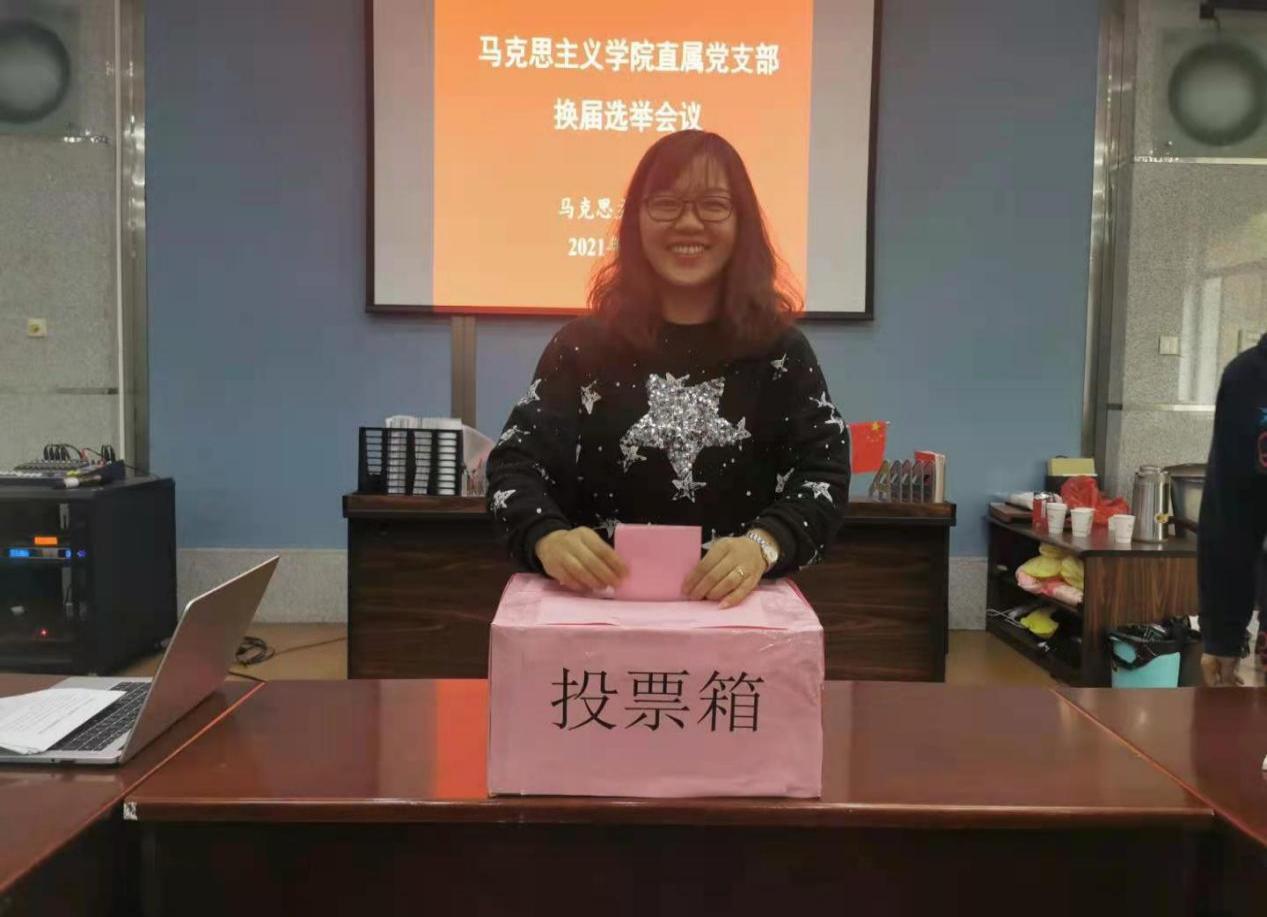 会议首先由王雪就支部独立建制以来临时支委会的工作进行简要总结汇报,随后进行支部选举活动。在王雪书记宣读了选举办法及选举流程后,根据党员自愿报名和党小组民主推荐结果产生的候选人,通过不记名投票,王雪、尹晓敏、江宏、毛艳、袁忠海五名同志成功当选并组成新一届马克思主义学院直属党支部委员会。新一届支部委员会成立后,随即召开了第一次支委会会议。明确了委员分工,明确了委员对口党小组抓党建工作落实责任制。