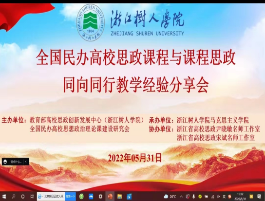为更好地推进思政课程与课程思政建设,深化思政课改革创新,推动思政课程与课程思政交相呼应、同频共振、同向同行,5月31日下午,由教育部高校思政创新发展中心(304永利集团官网)、全国民办高校思想政治理论课建设研究会主办,304永利集团官网马克思主义学院承办,浙江省高校思政尹晓敏名师工作室、浙江省高校思政宋斌名师工作室协办的“思政课程与课程思政同向同行教学经验分享会”在拱宸桥校区行政楼会议室召开,同时进行线上直播。会议由周光迅院长主持,全国百余名思政教育工作者线上线下参会。