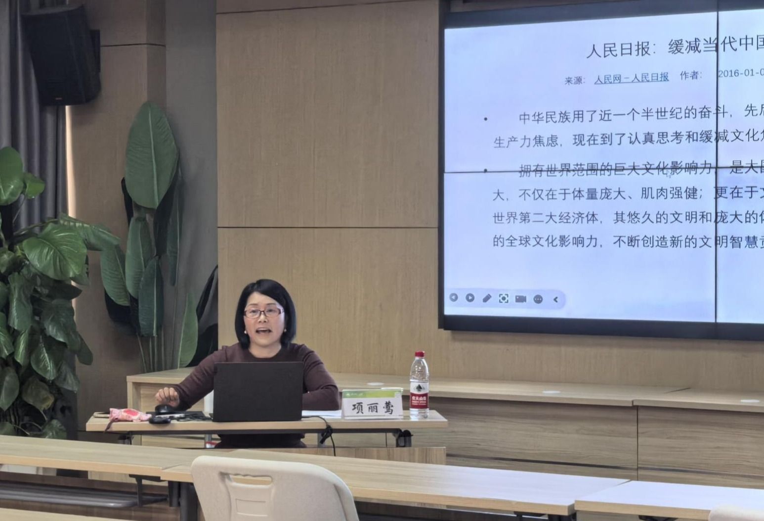 马克思主义学院项丽莺老师介绍了中华优秀传统文化在几千年历史中的创造和延续,强调了其作为中华民族的根和魂的重要性。她还强调了习近平总书记对中华优秀传统文化传承与发展的高度重视,并指出,我们一定要重视历史文化保护传承,保护好中华民族精神生生不息的根脉。