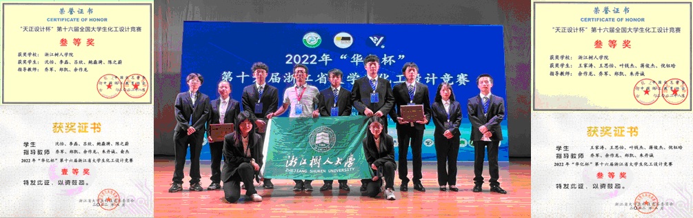 本次全国大学生化工设计竞赛和浙江省大学生化工设计竞赛,在学校教务处和生环学院的大力支持下,在郑凯,余作龙,乔军,朱丹诚,俞杰五位老师的全程倾力指导和学生的辛勤努力下,经过省赛、华东赛和国赛的层层选拔,最终获得国赛二等奖1项,三等奖3项;省赛一等奖1项(省赛连续3年一等奖),三等奖3项。同时一个参数队伍还获得最佳现代设计方法应用优秀奖的宝贵荣誉。