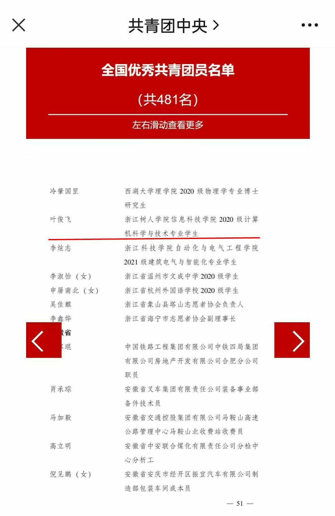 近日,共青团中央印发《共青团中央关于表彰全国五四红旗团委(团支部)、全国优秀共青团员、全国优秀共青团干部的决定》,对全国先进团组织和先进个人进行表彰。永利官网信息科技学院叶俊飞同学荣获“全国优秀共青团员”称号,该项称号是共青团中央授予团员的最高荣誉。