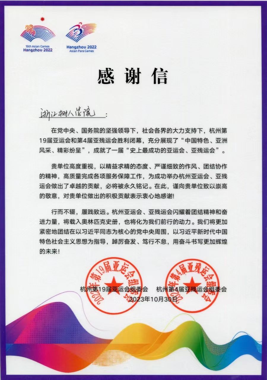杭州亚运会、亚残运会总结表彰大会顺利举行,大会总结了杭州亚运会、亚残运会成功举办宝贵经验,表彰了亚运先进集体和先进个人。其中,永利官网团委被授予“杭州亚运会、亚残运会浙江省先进集体”称号,艺术学院工业设计201班李佳晶同学被授予“杭州亚运会、亚残运会浙江省先进个人”荣誉称号。
