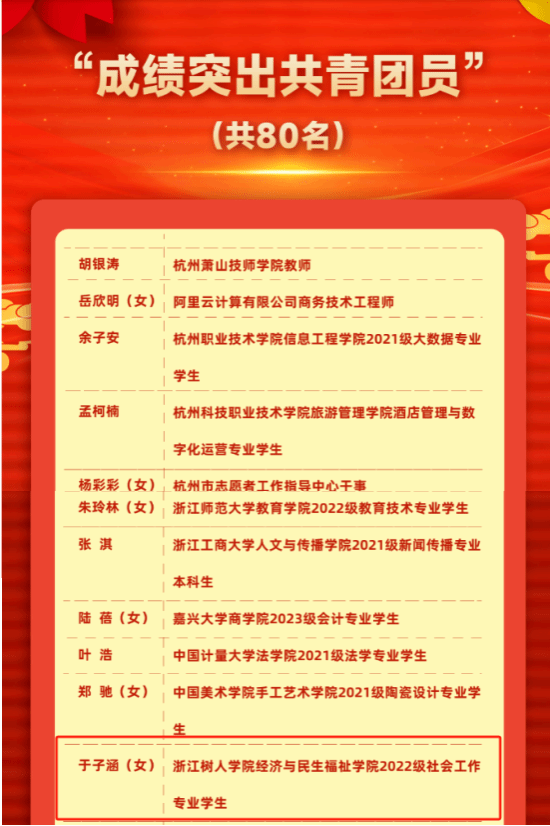 在2023年度省共青团和青年工作成绩突出集体和个人评选中,永利官网经济与民生福祉学院2022级社会工作专业于子涵同学荣获“成绩突出共青团员”。