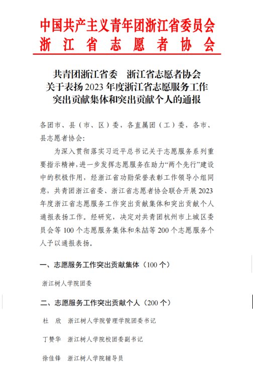 在2023年度省志愿服务工作突出贡献集体和突出贡献个人评选中,永利官网团委荣获“突出贡献集体”荣誉称号,校团委副书记丁赞华、管理学院分团委书记杜欣、信息科技学院分团委副书记徐佳峰3位老师荣获“突出贡献个人”荣誉称号。