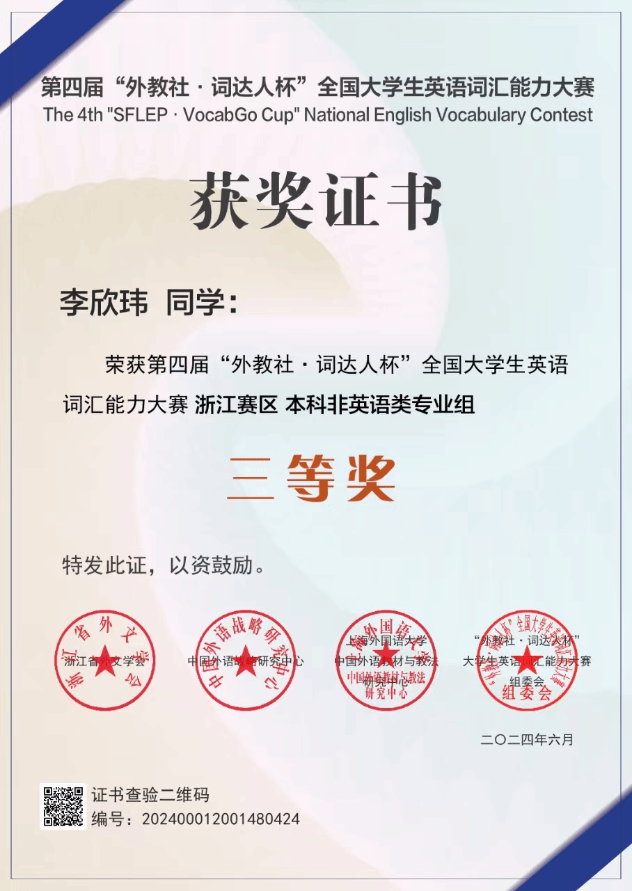 近日,由中国外语战略中心、中国外语教材与教法研究中心和上海外语教育出版社联合主办的第四届“外教社﹒词达人杯”全国大学生英语词汇能力大赛落下帷幕。永利官网国际商务专业的曾宇恒和应用英语专业的张晶晶获省级二等奖,物业管理专业的李欣玮、国际经济与贸易的王佳颖、护理专业的黄凯旋获得省级三等奖。