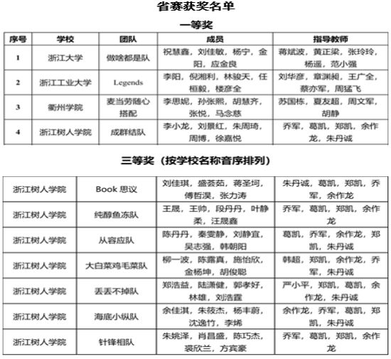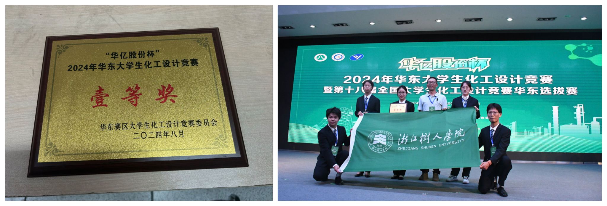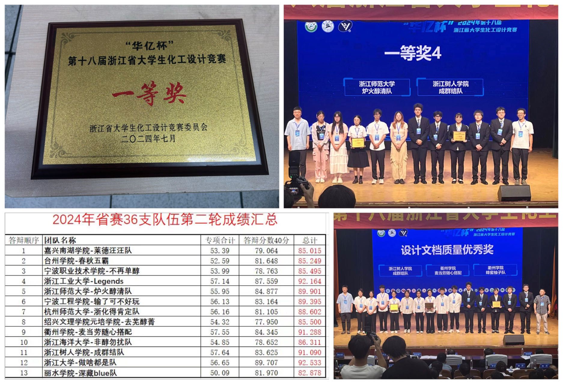 本次参加全国大学生化工设计竞赛和浙江省大学生化工设计竞赛,得到了学校教务处和生物与环境工程学院的大力支持, 在乔军、余作龙、郑凯、葛凯等主要老师的倾力指导和学生的辛勤努力下,应用化学22级成群结队团队参加现场答辩以综合排名第四的成绩获得省赛一等奖,同时还获得设计文档质量优秀奖。另外一支来自应用化学22级从容应队团队现场答辩获得华东赛小组第三名,获得全国二等奖。