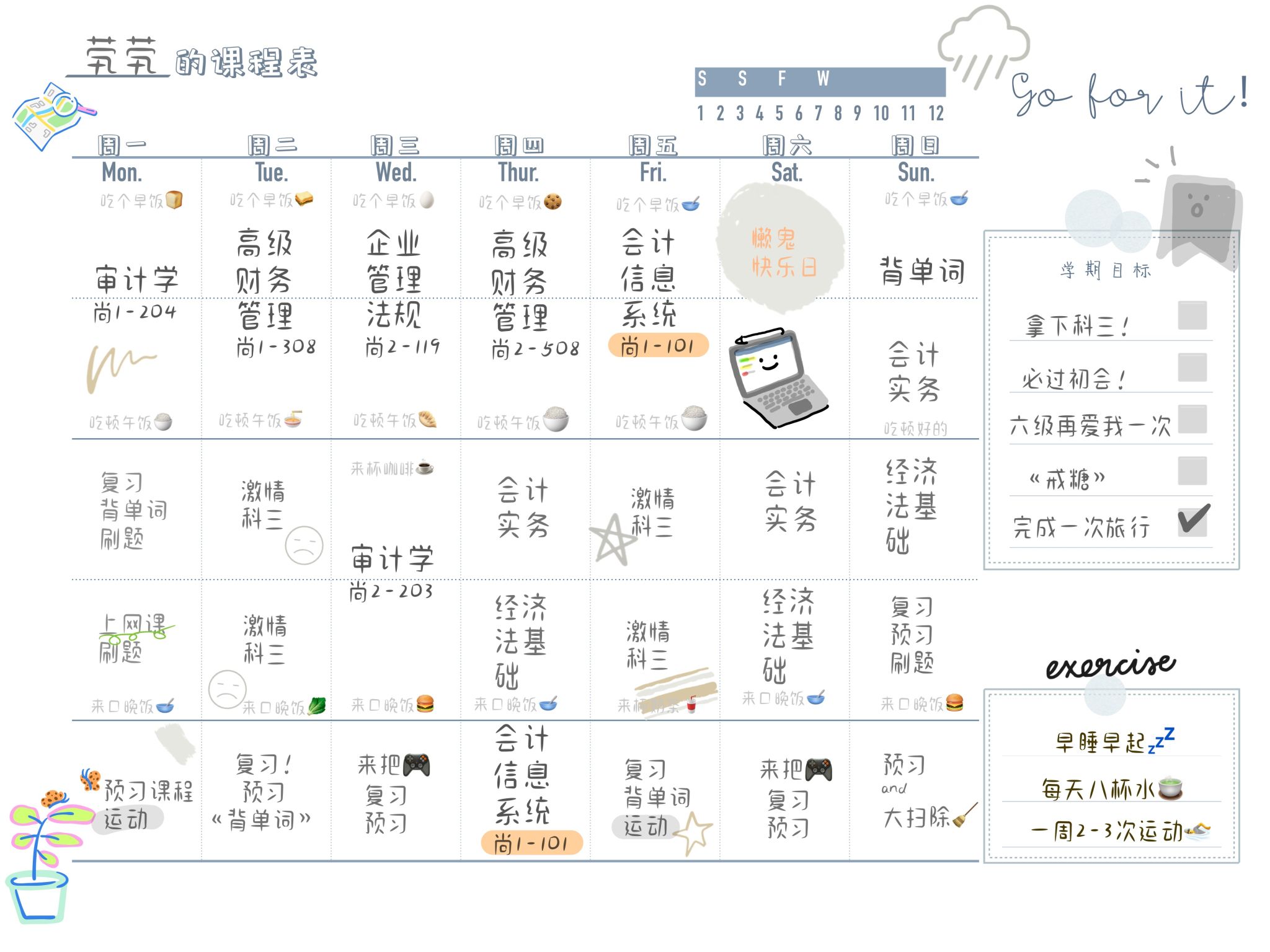 作息表可以让我的生活变得有秩序,不至于会有零散时间因为没有安排而浑浑噩噩的过去。劳逸结合,不知不觉提高自己的学习效率,也会让每天完成“任务”的自己收获感满满。靠每天高质量完成计划,减少没必要的焦虑,还可以培养自己的时间观以及克服拖延症,让自己更专注。