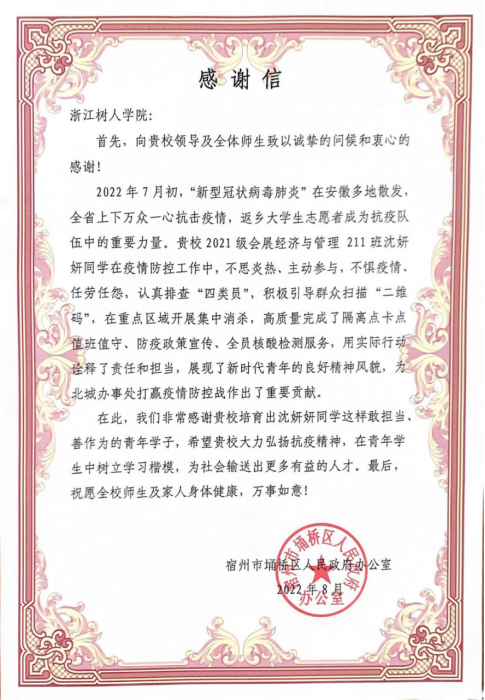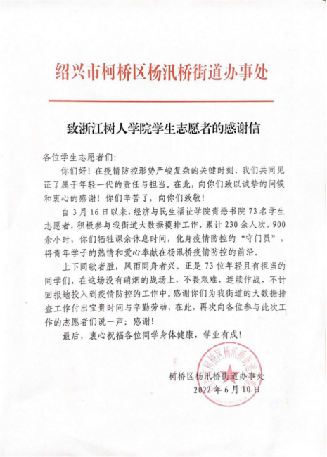 近日,经济与民生福祉学院青懋书院73名参与疫情防控的志愿者收到了绍兴市柯桥区杨汛桥街道办事处写给他们的感谢信,与此同时,会展经济与管理211班沈妍妍同学主动利用暑假时间加入抗疫队伍的行为得到了宿州市埇桥区人民政府的肯定。纸短情长,表达了政府各部门对志愿者们的深深谢意。这是经济学院深入进行“党建带团建”及“好学好习惯”两好工程的写照。