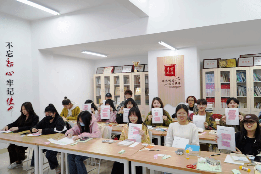 本次活动分为主题讲座、诗词创意拼贴、书签绘制、寄语献书等多个环节。