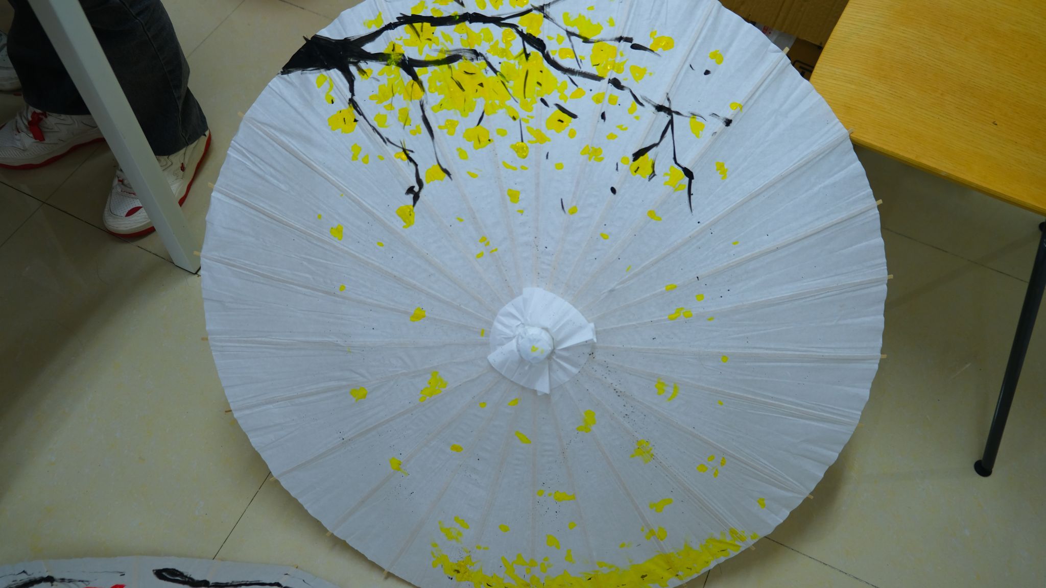 一柄柄有待上色的油纸伞等待着它的有缘人,也将活动氛围拉至古典时代油纸伞下的浪漫情怀中。同学们迫不及待地选取自己中意的油纸伞,挽起袖口提起画笔,发挥自己的想象力,一笔一画,一彩一韵,把自己的所念所想通过画笔呈现在伞面上,绘制出自己心中的那份浪漫。每一个作品都是那么独特,那么独一无二,每一笔每一画都倾注了自己的心血。