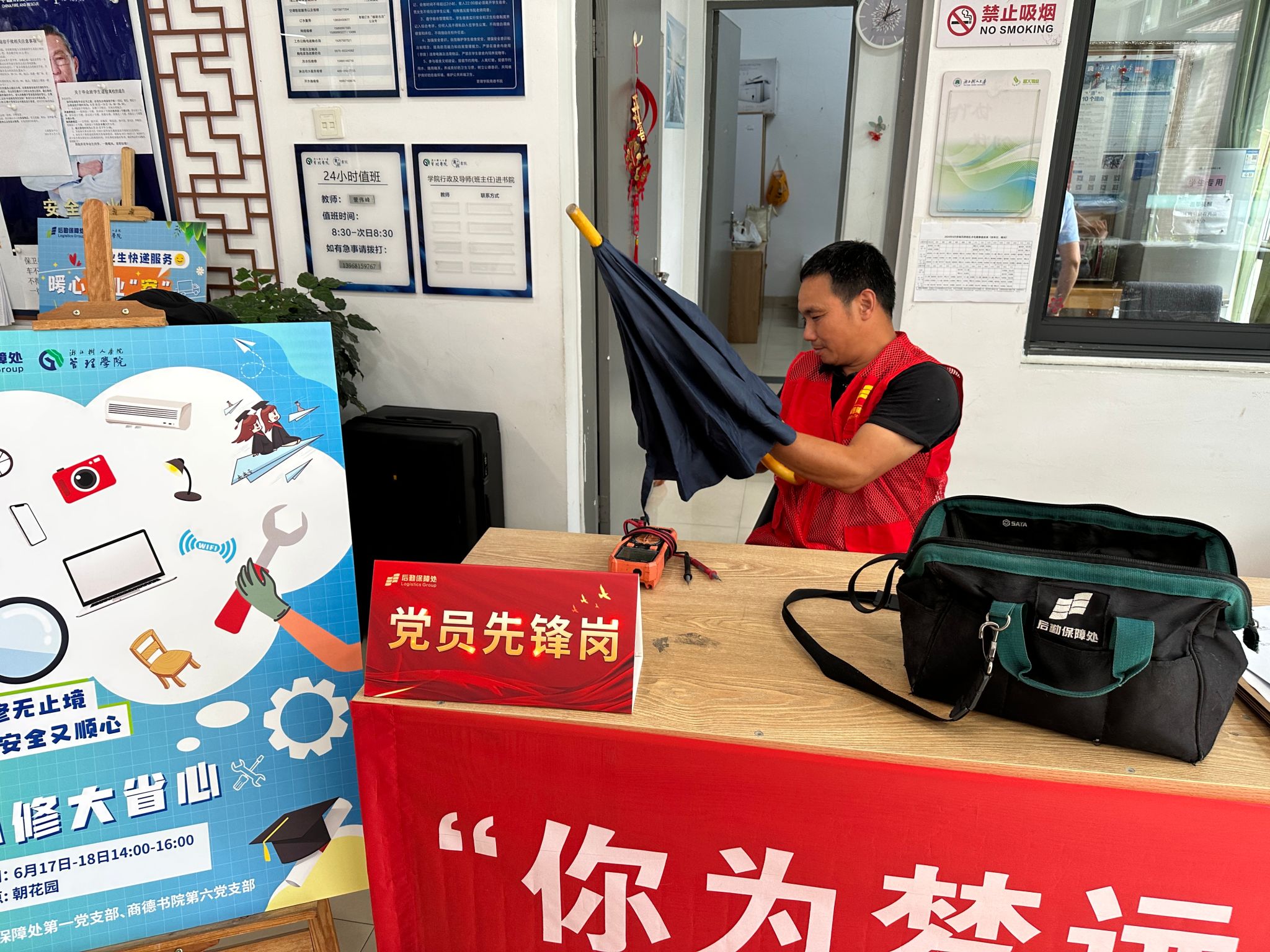 “小修大省心,最后一堂育人课”。第一党支部的维修师傅走进书院,为毕业生们现场提供各类维修服务。不同的工具在手中不断切换,通过拆卸、测量、更换配件、调试,一件件坏掉的小物品经过师傅的“诊治”,又焕发出了新的生机,在维修过程中也会为毕业生们普及安全用电和电器保养相关知识,希望在毕业后没有“半小时响应”的校园维修师傅了,也能动手解决生活中出现的简单维修问题。