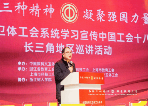 12月5日下午,全国教科文卫体工会系统学习宣传中国工会十八大精神长三角地区巡讲活动在永利官网杨汛桥校区礼堂成功举办。浙江省总工会常委、二级巡视员、省教育工会主席王玉庆,中国教科文卫体工会卫生体育工作部部长郎佩剑以及中国教科文卫体工会、长三角地区教科文卫体工会有关负责同志等出席。校党委书记章清、纪委书记、工会主席陆桂芹及分工会主席等参加了活动。活动邀请了部分长三角地区劳模工匠、在杭高校工会负责人及师生代表600余人现场聆听宣讲。