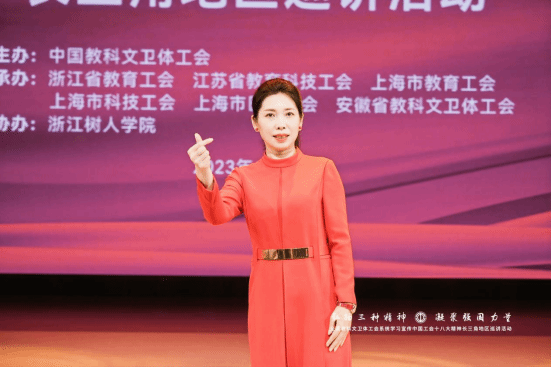 王玉庆主席在致辞中指出,今天长三角的劳模工匠代表齐聚浙江,与大家一起分享学习宣传贯彻中国工会十八大精神的收获和体会。相信通过巡讲活动,必将进一步激励长三角地区教科文卫体工会系统广大职工弘扬劳模精神、劳动精神、工匠精神,学先进、赶先进,争做新时代的奋斗者,凝聚起为强国建设民族复兴团结奋斗的智慧和力量。当前,学习宣传贯彻习近平总书记的重要讲话和中国工会十八大精神,正在全省教育系统各级工会深入开展。希望全省教育系统工会以此次中国工会十八大精神长三角地区巡讲活动为契机,进一步掀起学习高潮,汇聚起踔厉奋发新征程的磅礴伟力,团结引领广大教职工以更高站位、更强担当,为谱写中国式现代化浙江篇章不懈奋斗。