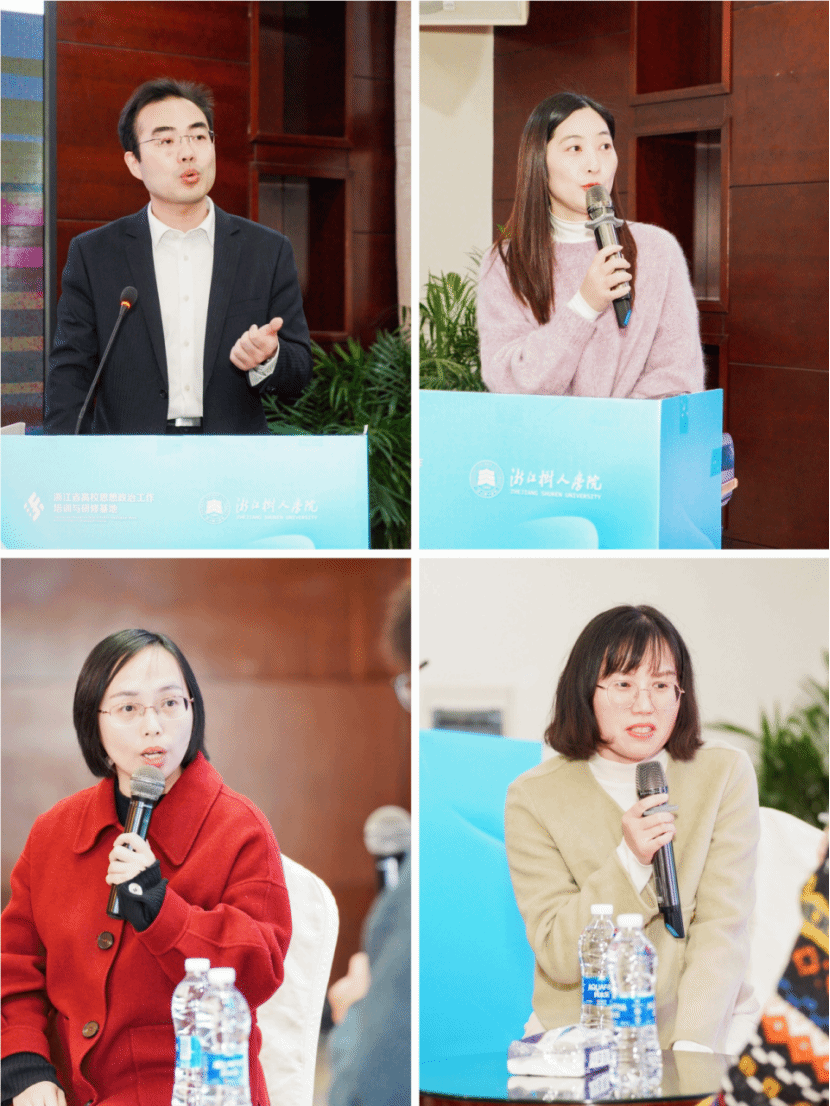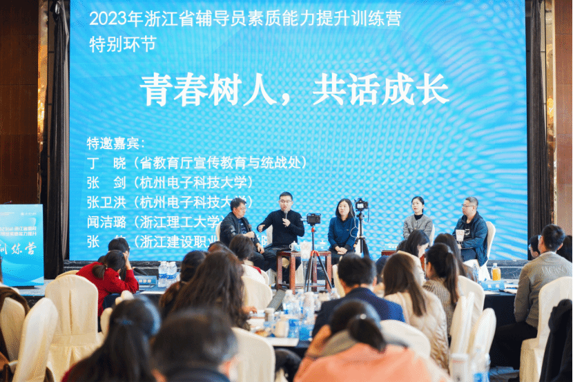 师生关系是辅导员开展思想政治教育工作的重要基石,为了在培训中更深入地探讨这一主题,浙江省教育厅宣传教育与统战处调研员丁晓与杭州电子科技大学张剑老师、张卫洪老师,浙江理工大学闻洁璐老师,浙江建设职业技术学院张伟老师等四位优秀辅导员共同参与了特别环节“青春树人,共话成长”的主题分享。他们聚焦“关系”“信任”“语言”“技巧”和“成长”五个关键词,与学员们分享了实际工作中与学生谈心谈话的宝典秘籍。