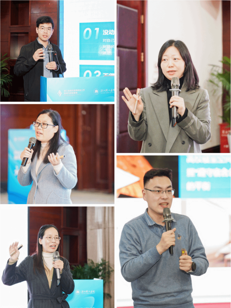 辅导员素质能力大赛国赛一等奖、浙江大学国际联合学院(海宁国际校区)书院副院长兼学生事务部副部长吴行,省赛一等奖、宁波大学辅导员吴琳华,浙江大学求是学院党委副书记詹美燕,浙江农林大学学院党委副书记应莺,浙江工业大学生物工程学院党委副书记金鑫,304永利集团官网管理学院党委副书记王伟君,浙江工商大学辅导员、辅导员素质能力大赛国赛三等奖、省赛一等奖李鹏飞针对不同类型谈心谈话和案例研讨案例进行了高质量的名师示范,让学员们钦佩之余收获良多。