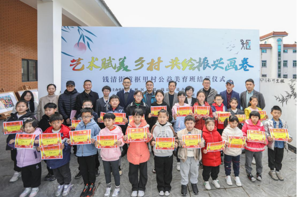 当天恰逢枢里公益美育班结营仪式,现场展出了本期美育课堂优秀儿童画作品以及农民画作品,优美的画作体现了儿童、村民独特的审美视角,他们用色彩和创意点亮了乡村的未来!现场还举行了优秀学员颁奖仪式。