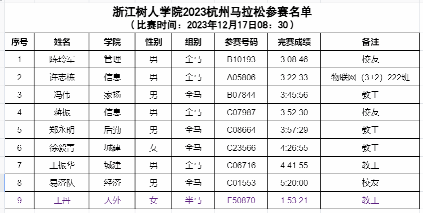 2023年12月18日星期天8:30,由浙江省体育局、杭州市人民政府共同主办的2023杭州马拉松在黄龙体育中心鸣枪开跑,来自约20个国家和地区的近30000名跑友用跑步传递自信乐观,共迎美好期许。永利官网师生校友共有9人参加了本次赛事。