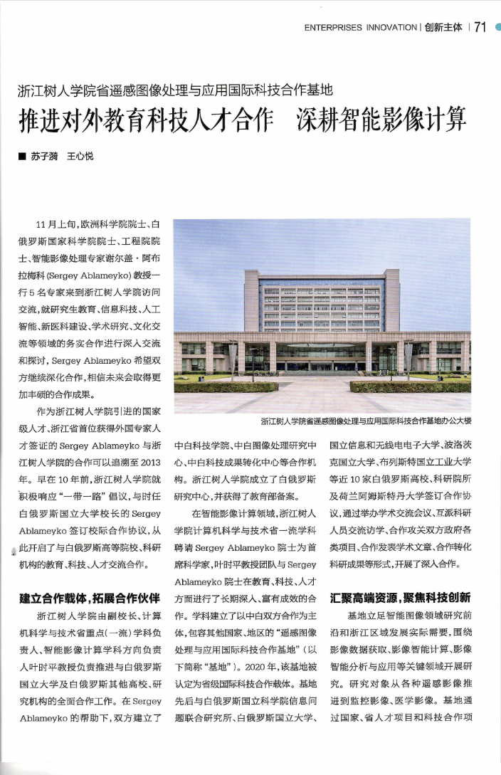 近日,《今日科技》报道永利官网遥感图像处理与应用浙江省国际科技合作基地(以下简称“基地”)建设情况。
