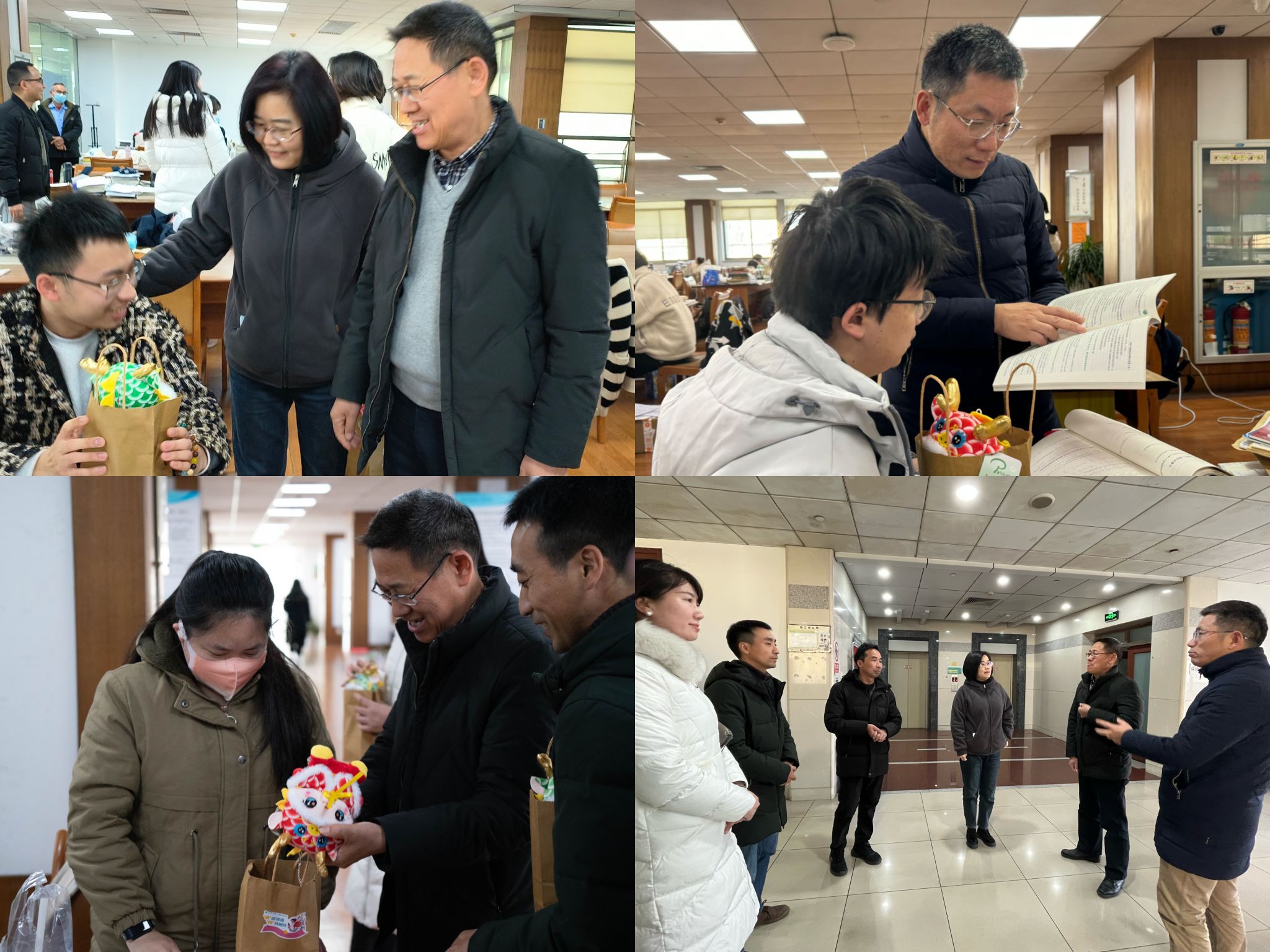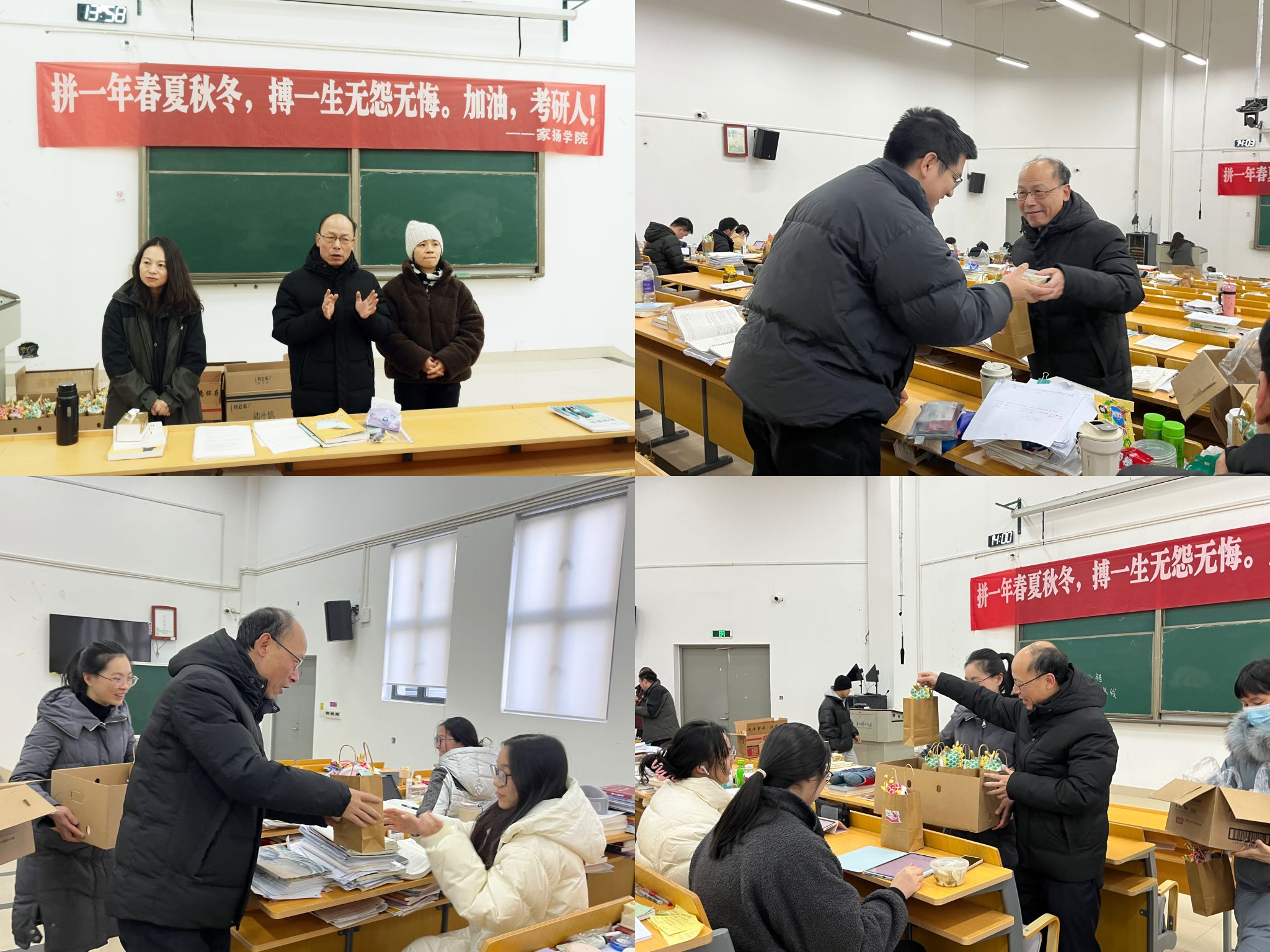 多彩福袋,关怀备至。12月21日下午,校领导王军、陈新民、陈浚在家扬学院和后勤保障处的负责人陪同下,分别带队前往考研自习室慰问备考学子,亲切问询备考状态并逐一送上精心准备的加油福袋,由龙年公仔、定胜糕、香蕉、橙子组成的加油福袋及新鲜出炉的饺子下午茶,寓意天之骄子、旗开得胜、骄人成绩、心想事成。领导们亲切慰问,并提醒大家在最后的冲刺阶段劳逸结合,调整心态,从容面对考试。