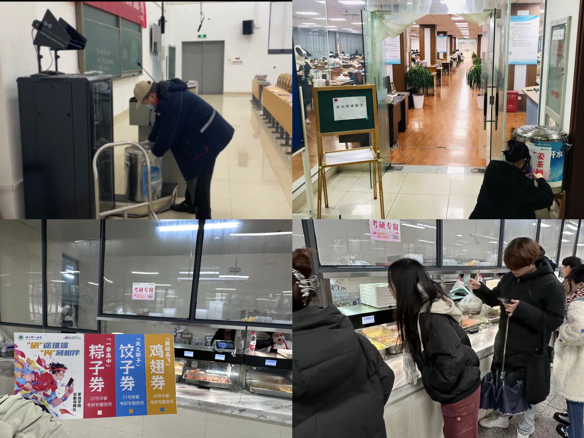 “饮”你上岸,元气满满。近日连续降温,天气寒冷,为应对严寒天气带来的影响,12月18日-22日每天清晨现熬红糖姜茶配送至两校区考研自习室,帮助同学们增强御寒能力;致勤、树人之家二楼、朝瑾、小落等四个餐厅开设考研专窗供应通过“一‘研’为定”“展翅高飞”“天之骄子”“一举高中”等四款不同祝福的菜品,为考生补充满满元气。
