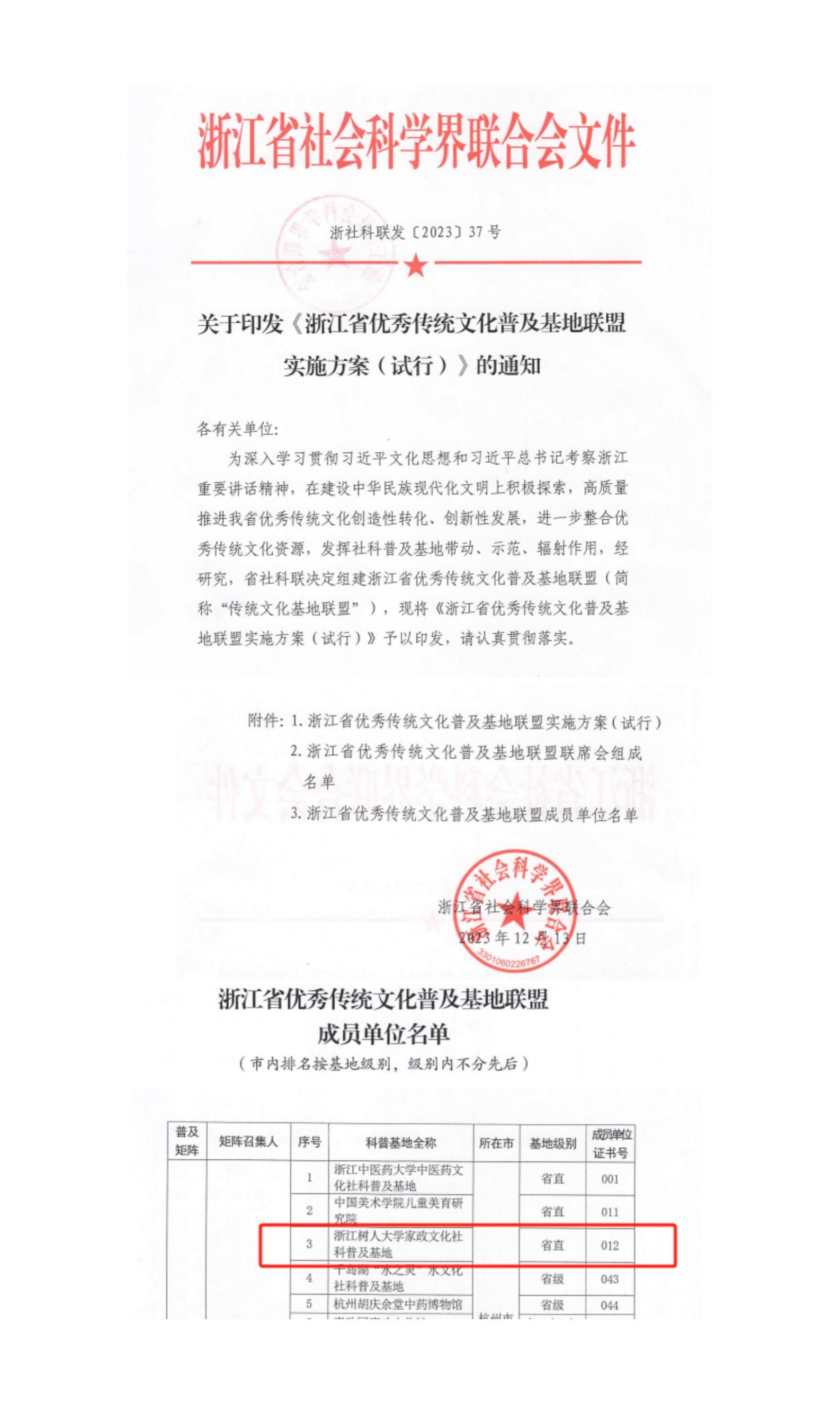 为深入学习贯彻习近平文化思想和习近平总书记考察浙江重要讲话精神,在建设中华民族现代化文明上积极探索,高质量推进我省优秀传统文化创造性转化、创新性发展,进一步整合优秀传统文化资源,发挥社科普及基地带动、示范、辐射作用。浙江省社科联决定组建“浙江省优秀传统文化普及基地联盟”,以四大普及矩阵方式,传播中华优秀传统文化、提升公众人文素养、促进人的全面发展。