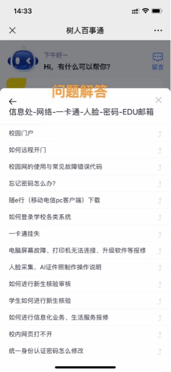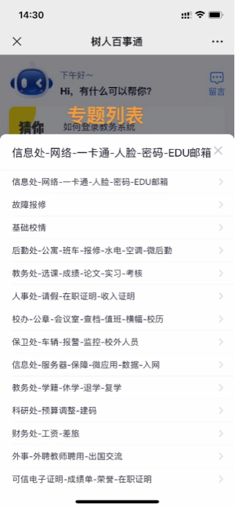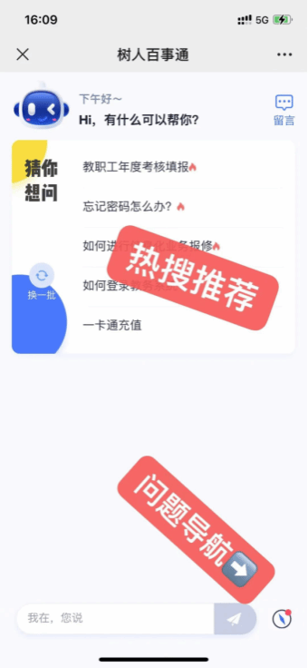 “树人百事通”会根据用户实际使用情况,主动将近期内提问量最多的若干条问题以热搜的形式显示在聊天界面的最初记录中。通过师生的使用数据以及当前业务期,可进行top5的热门FAQ推荐,方便师生更快的找到所需答案。