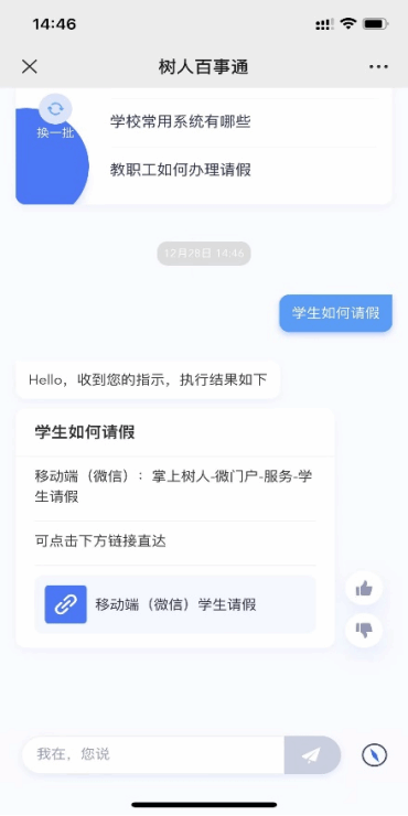 根据师生输入的问题,智能客服机器人“树小e”会自动分析其业务场景,并对校内支持其业务的应用进行自动定位,直接将支持该业务场景的应用入口推送给用户,用户可直接点击应用入口访问该应用。