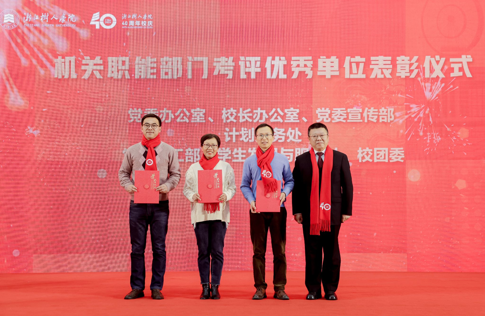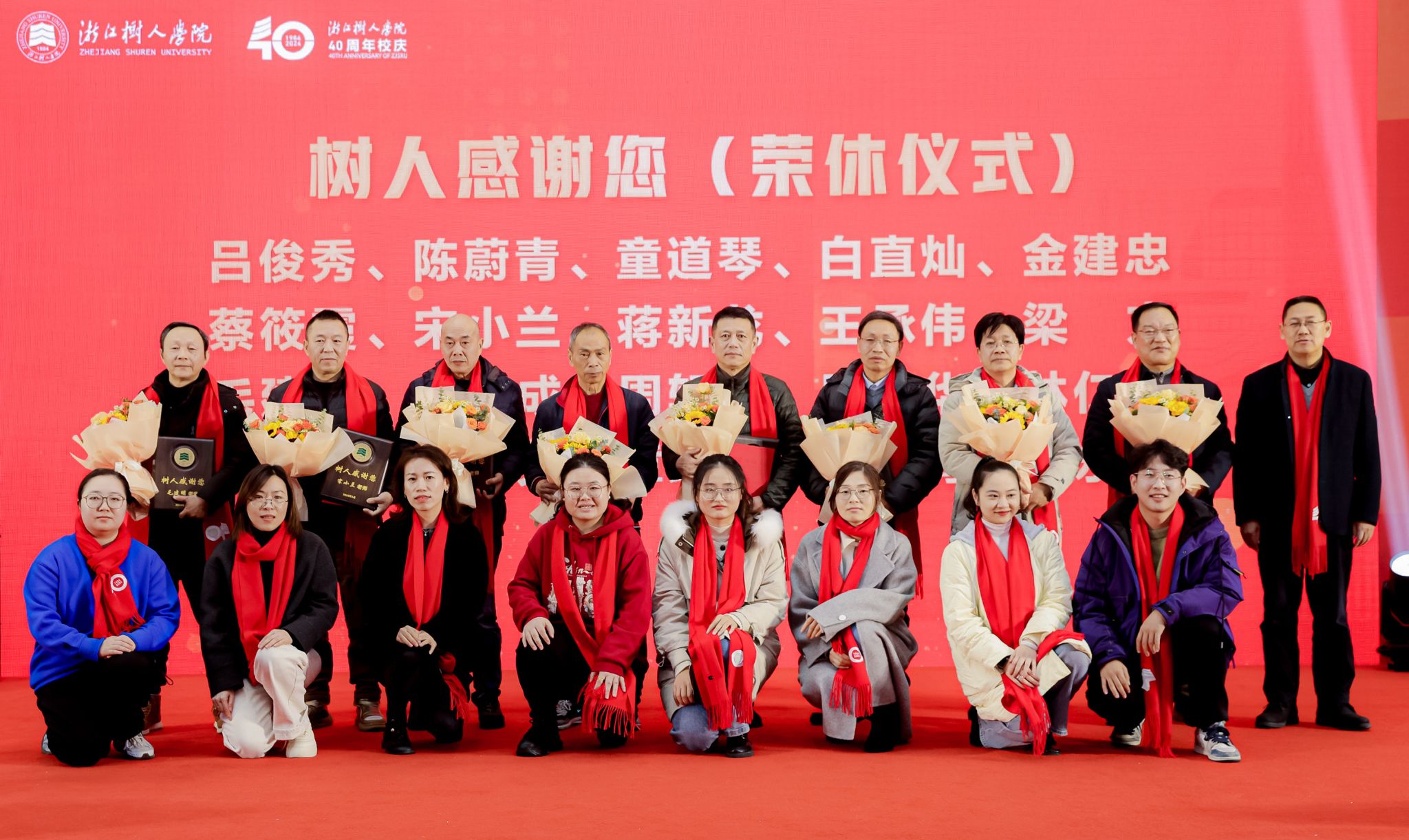 团拜会还开展了“树人祝贺您”“树人感谢您”活动,为2023年度校院两级目标管理考评、机关职能部门考评、二级党组织党建工作考核优秀单位颁奖,为2023年高级专业技术职称获得者代表、荣休教职工颁发证书;发布了建校40周年校庆主标志(LOGO)、学校重点活动安排,为建校40周年校庆主标志(LOGO)设计获奖者颁奖,为“树人添彩”首批捐赠校友代表颁发捐赠证书。