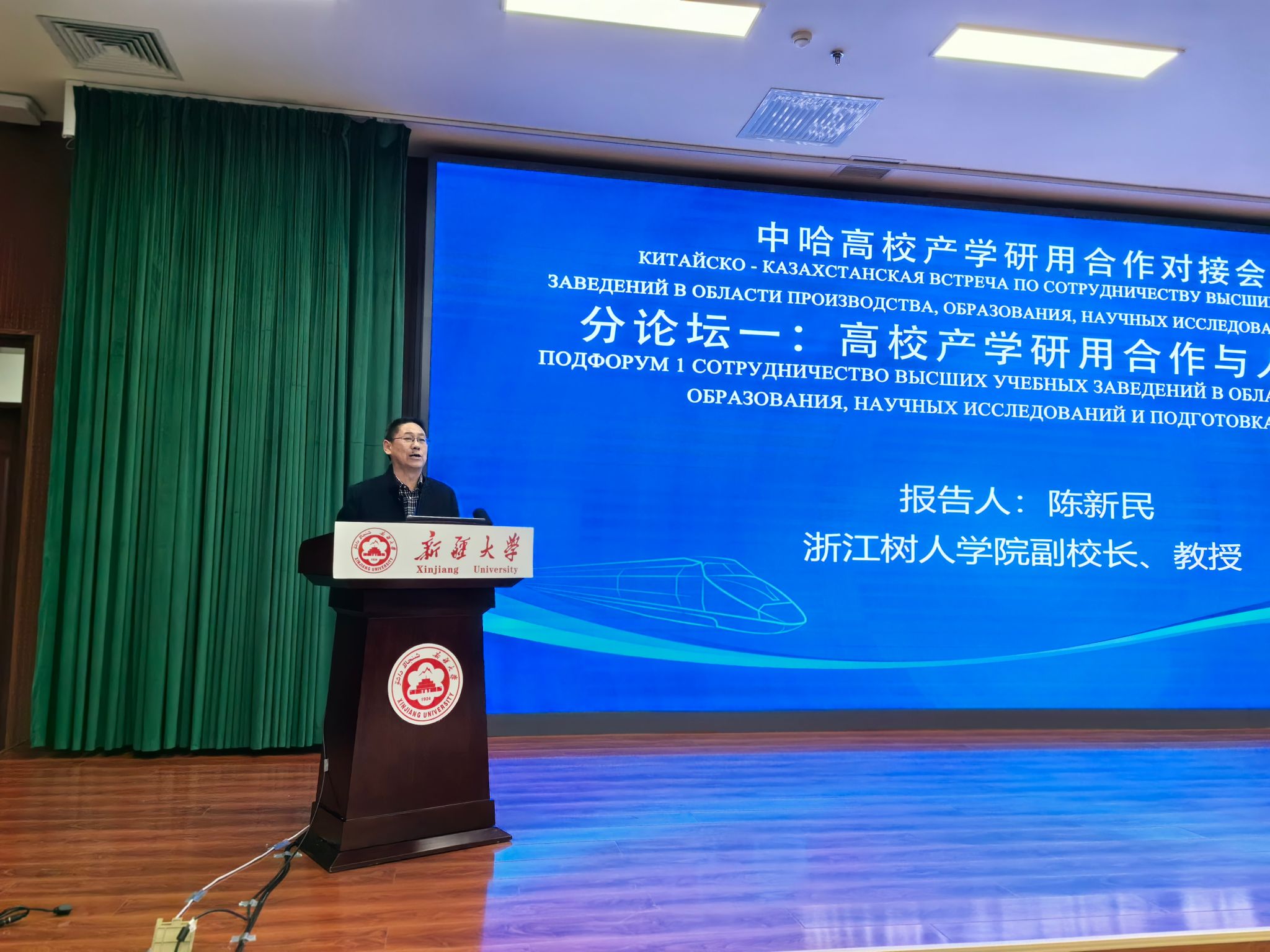 为落实中国—中亚峰会成果,加快推进中哈高校在人才培养、科学研究、学术交流、师生互访等领域交流合作,深化两国高校、科研院所、企业产学研用合作,1月26日,由教育部指导、新疆维吾尔自治区教育厅主办的“中哈高校产学研用合作对接会”在新疆大学隆重举行,来自全国3个省(市、自治区)政府主管部门、78所高校、40家企业的300多名代表参加会议。教育部副部长孙尧、哈萨克斯坦科学和高等教育部副部长达尔汉·艾哈迈德·扎基、新疆自治区区委常委宣传部长王建新等领导出席会议并作重要讲话。受李鲁校长的委托,永利官网陈新民副校长率有关部门负责人参会并作主旨发言。