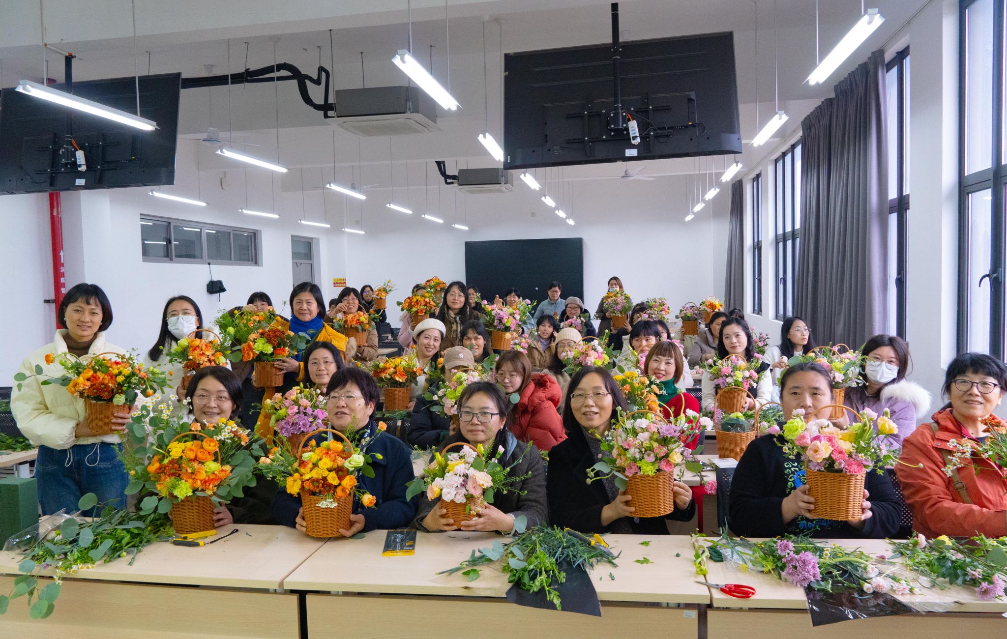 3月6日下午,教职工插花花艺活动在杨汛桥校区弘毅3号楼多功能教室举行,50余名女教师齐聚一堂,在一片春意盎然和五彩缤纷中,感受花艺魅力。本次活动得到了城建学院分工会和教职工花艺社的大力支持,陈丹维老师化身花艺教师,为大家讲解插花相关知识,并示范制作花艺的基本技巧。在陈老师的指导下,老师们纷纷修剪枝叶、设计造型,享受创作的乐趣和插花艺术带来的美好体验,看着通过自己双手制作成的花艺作品,每个人的脸上都洋溢着喜悦的笑容,收获了满满的好心情。
