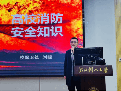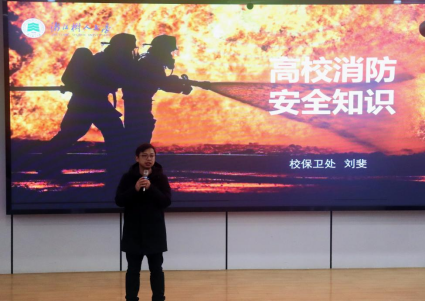 接着,由保卫处副处长刘斐老师开始本次讲座。他指出,本次消防安全知识讲座需要重点掌握“四个能力”:检查消除火灾隐患能力;扑救初期火灾能力;组织人员疏散逃生能力;消防宣传教育培训能力。理解学习“四懂四会”:“四懂”即懂得岗位火灾的危险性,懂得预防火灾的措施,懂得扑救火灾的方法,懂得逃生的方法;“四会”即会使用消防器材,会报火警,会扑救初期火灾,会组织疏散逃生。接着,刘老师对“四懂四会四能力”进一步讲解并强调以下三点:第一,火灾是一种极具破坏性的灾害,我们必须时刻保持警惕,熟练使用消防器材,以便在真正发生火灾时利用火灾初期黄金100秒内迅速消灭火源,迅速撤离,安全逃生。第二,火灾责任问题,一旦发生火灾,相关责任人将面临法律制裁。第三,寝室是火灾发生的重要区域。寝室吸烟、电气线路故障、照明灯等电子设备使用或摆放不当等都是导致寝室火灾的重要原因。故要规范电器使用,在使用电器时,要确保电路负荷适中,避免电线过热引发火灾。