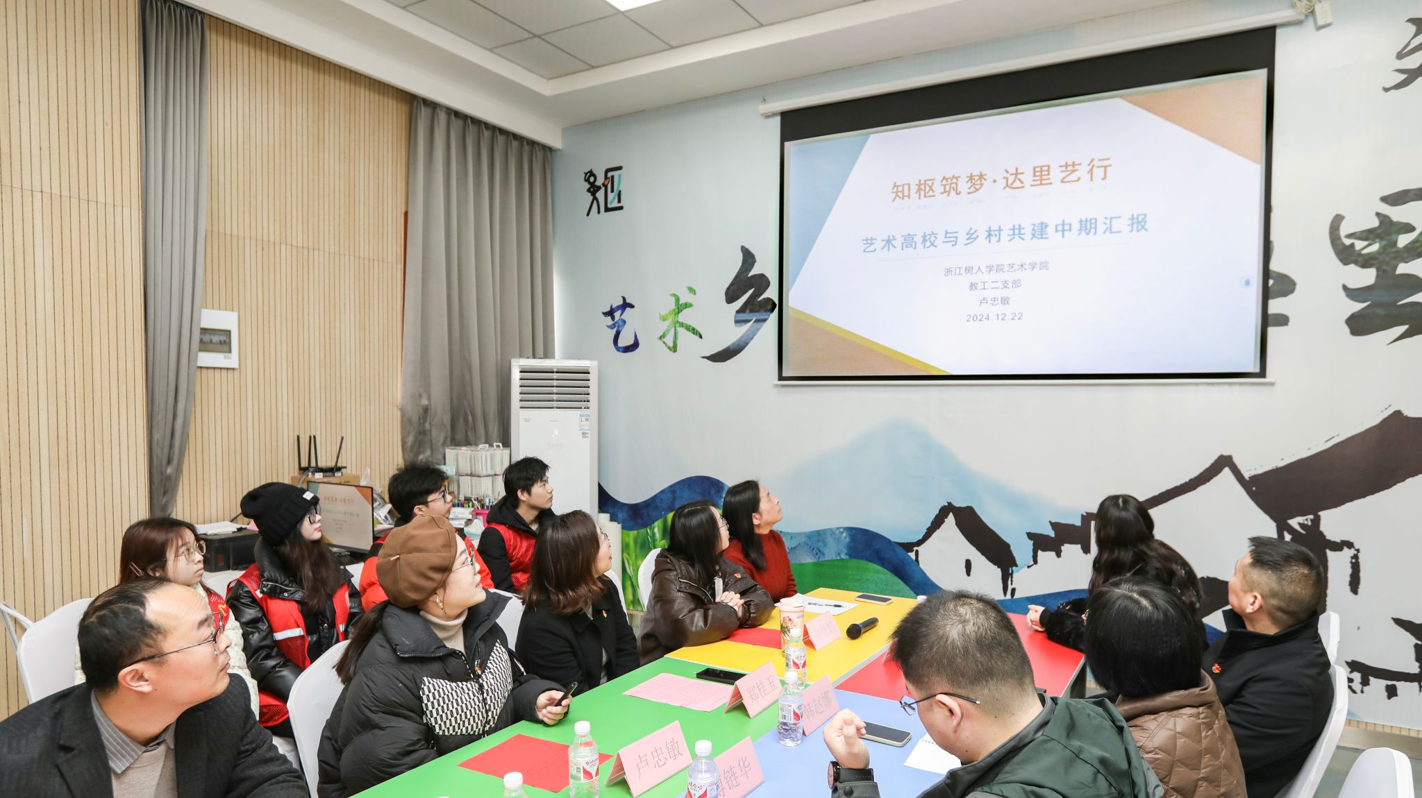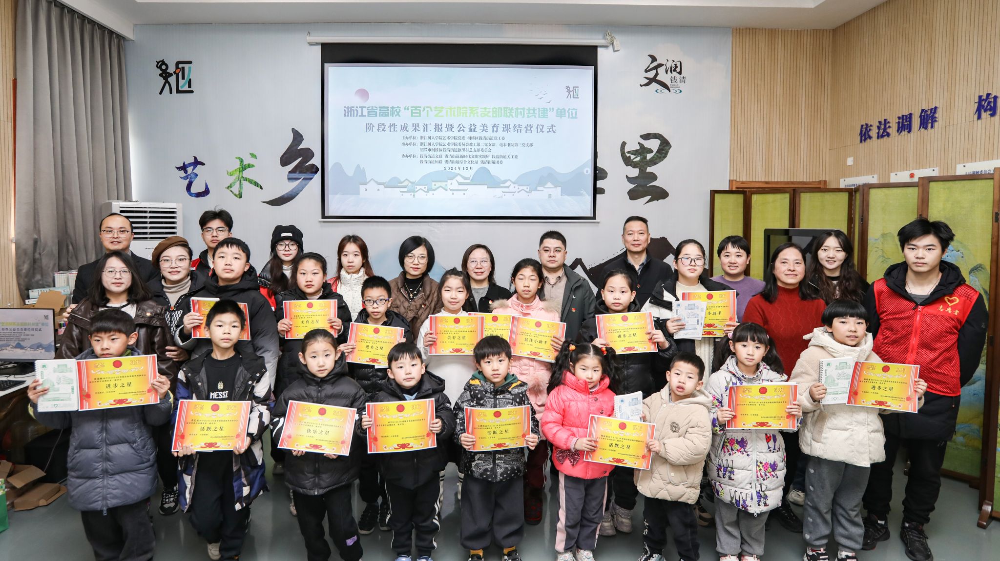 2024年12月22日,304永利集团官网艺术学院教工二支部与毫末三支部“百个艺术高校与乡村共建”中期汇报在钱清街道枢里村文化礼堂举行。304永利集团官网艺术学院党委书记郑桂玉、艺术学院党委委员吕清海、艺术学院教工二支部书记卢忠敏、艺术学院毫末三支部金佳虹、钱清街道党工委委员韩赵娜、钱清街道党工委委员傅链华、钱清街道枢里村党总支书记石剑锋等校地双方代表,以及枢里村美育课堂“小老师”代表、美育课堂全体学员和枢里村农民画家代表参加会议。