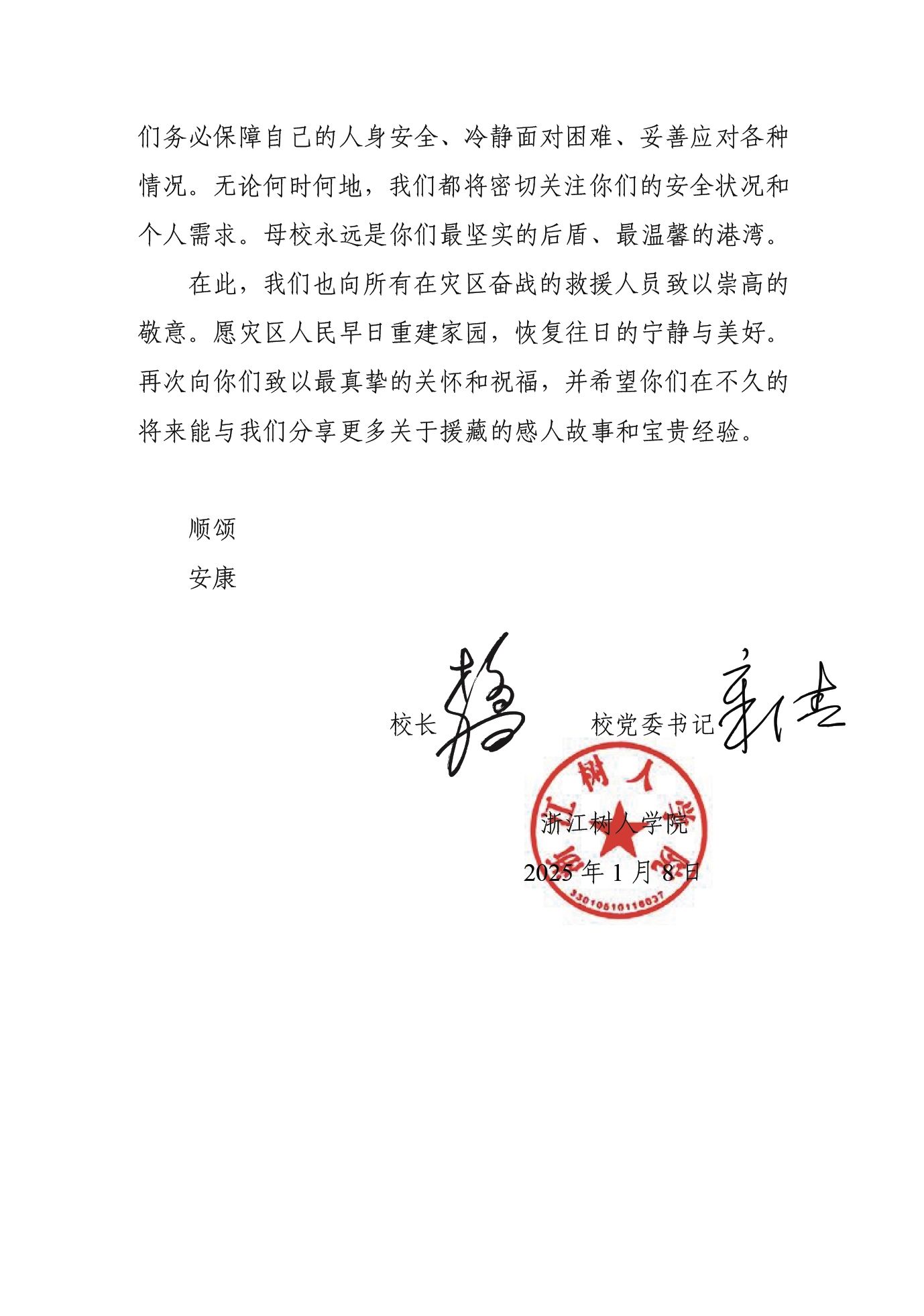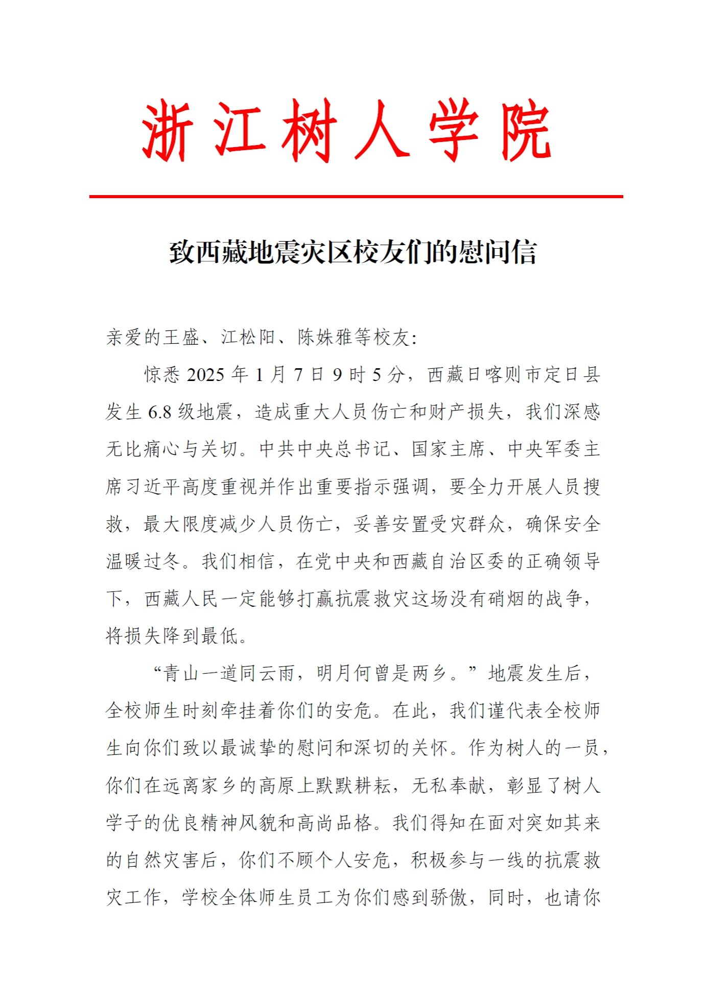 致西藏地震灾区校友们的慰问信