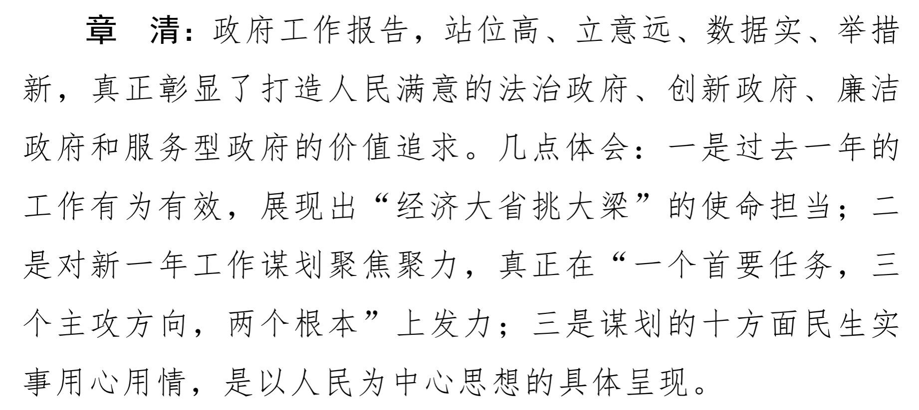 章清书记在发言中表示,政府工作报告,站位高、立意远、数据实、举措新,真正彰显了打造人民满意的法治政府、创新政府、廉洁政府和服务型政府的价值追求。几点体会:一是过去一年的工作有为有效,展现出“经济大省挑大梁”的使命担当;二是对新一年工作谋划聚焦聚力,真正在“一个首要任务,三个主攻方向,两个根本”上发力;三是谋划的十方面民生实事用心用情,是以人民为中心思想的具体呈现。