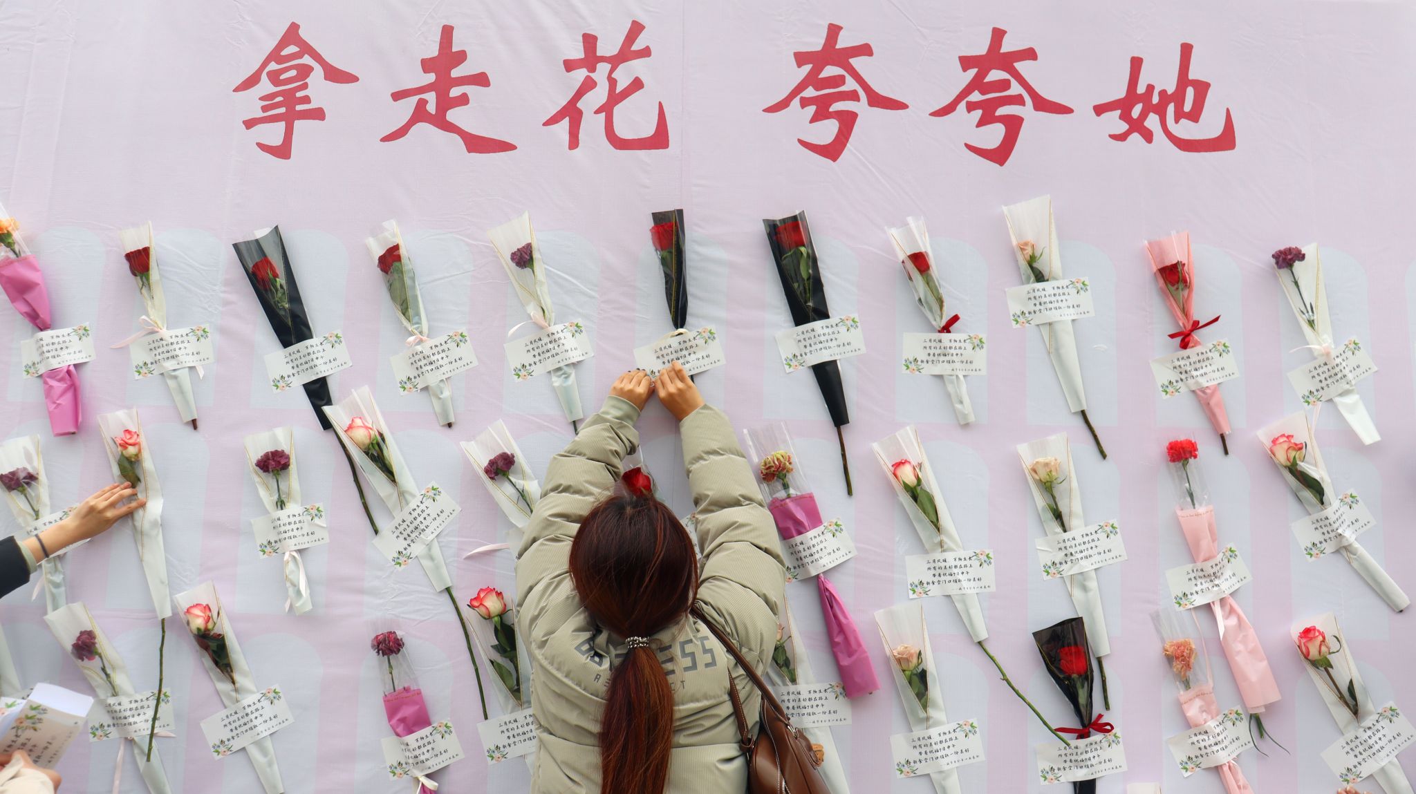 拱宸桥校区树人之家广场和杨汛桥校区食源广场的“拿走花 祝福她”活动现场人头攒动、热闹非凡。同学们纷纷在“幸福”便签上写下对她们的祝福,并换取一束鲜花送给身边的她。“祝妈妈永远年轻!”“致敬每一位闪闪发光的女性!”……不到一小时,留言墙已被真挚的话语填满。