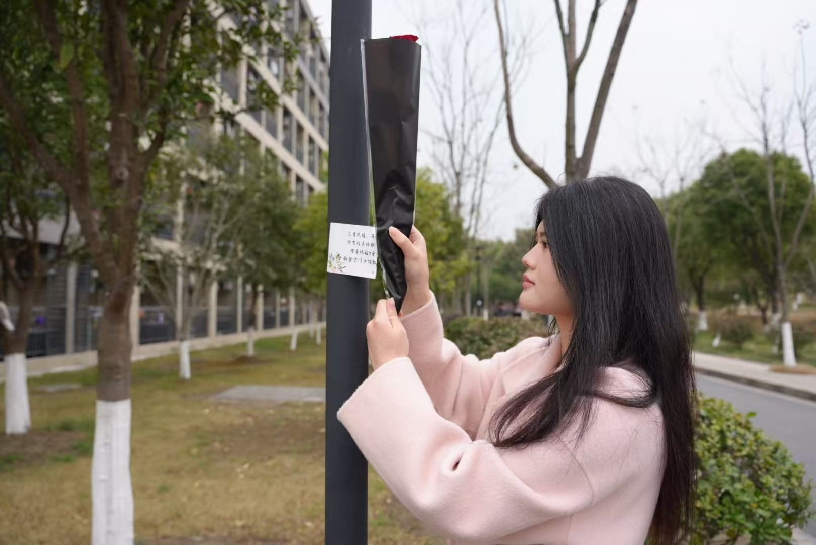666支鲜花空降在校园主干道旁的树干上,每一束花搭配一张温暖与诚挚的祝福,以一种细腻而温暖的方式将爱传递给校园里每一位“她”。师生们纷纷驻足,或取花自留,或转赠身边的人。明哲书院蒋灿灿同学表示:“没想到随手就能带走一份心意,我把这份幸福传递给我的室友,她一定会很开心。”