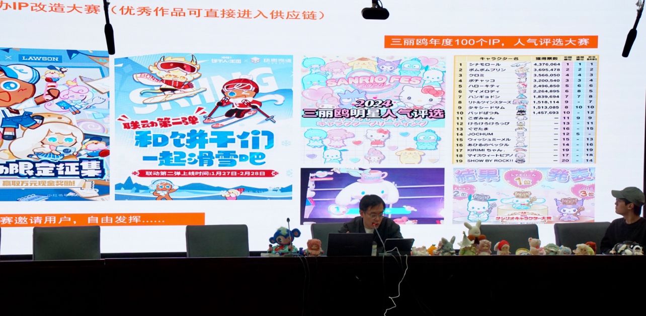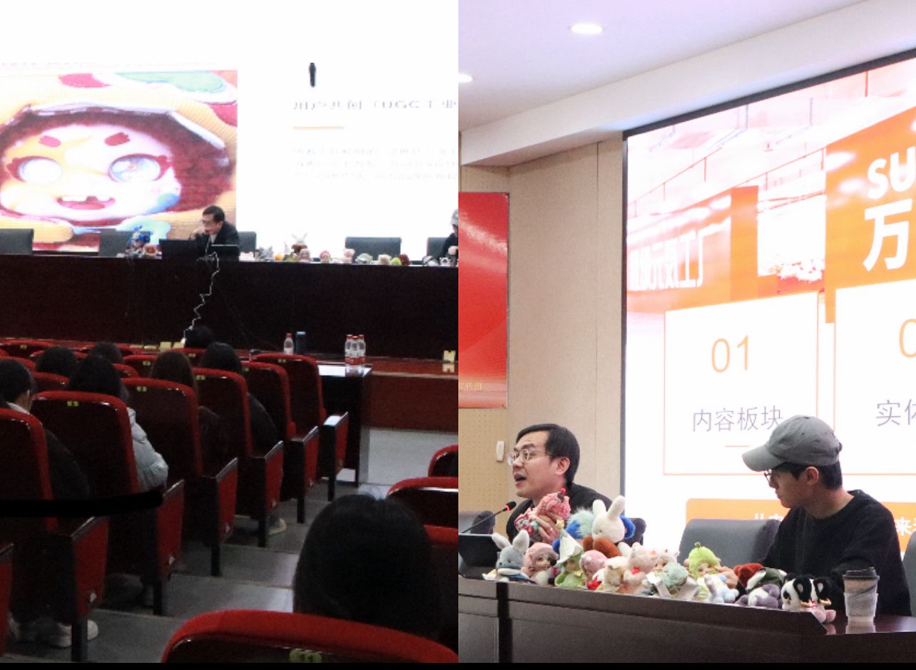 夏殷周从内容创作(解决创意的不确定性)展开,从搭建人设数据库、筛选分析、IP实验室机制、内容生产链、优胜略汰、打造内容生态链、IP矩阵化等环节,仔细介绍了企业IP孵化流水线的过程,直至最后创作出一个成功的IP。他从一个个生动的案例,以图片及实物展示的形式,分享成功案例经验。同学们也在轻松趣味的氛围中学习到了行业实际的创作规范与经验。夏殷周积极鼓励大家去尝试创业,并表示公司愿意组建团队,企业出资,孵化在校期间有理想的大学生创业人才。